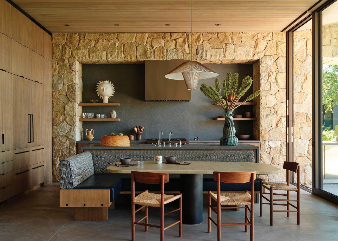 Innovation and craftsmanship define the work of the renowned firm Marmol Radziner. This open-plan kitchen, dining, and living area flows effortlessly to an expansive roof garden and pool, uniting architecture and landscape. Locally sourced Santa Barbara sandstone walls—some incorporating boulders found onsite—create a grounded, tactile envelope. Honed basalt countertops and backsplashes introduce an earthy contrast with subtle tonal variation, reinforcing the organic palette. Finely curated details include an Eric Roinestad vessel from The Future Perfect, a pendant by Smilow, and a ceramic piece from Lawson-Fenning, all complementing a custom banquette. A dining table, designed and produced by the Marmol Radziner fabrication team, anchors the composition with sculptural presence. Photo: Roger Davies marmol-radziner.com