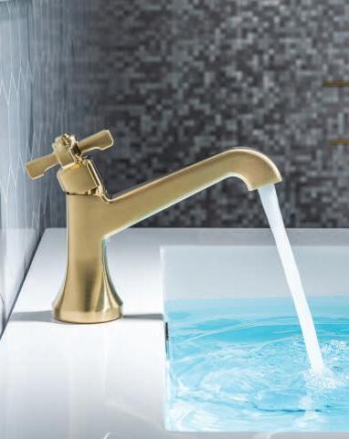 The Series 230 Collection, inspired by the brilliance of emerald-cut diamonds, complements both modern and traditional interiors. The elegantly arched spout mirrors the flow of water, while the minimalist lever handles complete the composition with refined grace. flussofaucets.com