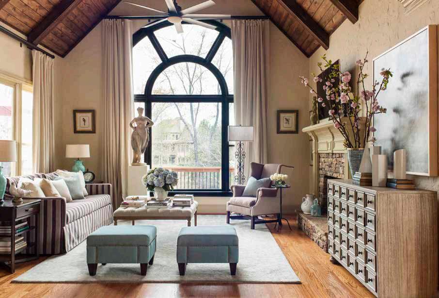 focal point. We accomplished this by adding beams, boards, and battens to the ceiling and painting the window arches black, which gave the room a wow factor.