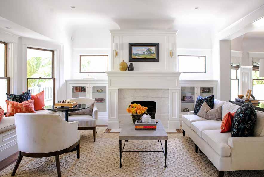 The passageway between the rooms was short, narrow, and tight, so we removed the pocket door and made the opening as wide as possible. That allowed me to furnish the area around the fireplace symmetrically and add a little more breathing space to the living room, which had originally crept into the passageway. We also kept the casework but made it bigger and painted it and the windows white as a gorgeous reference point to the original architectural language. We then added a softback sofa that serves as an elegant transition to the dining room. Now, the space feels great room-like but still has a beautiful passageway.