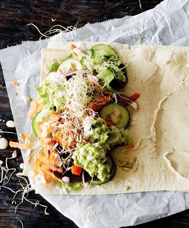4/ Fold over the bottom of each wrap and roll over the shorter side, trying to catch all of the ingredients as you roll. Roll up completely and serve.
