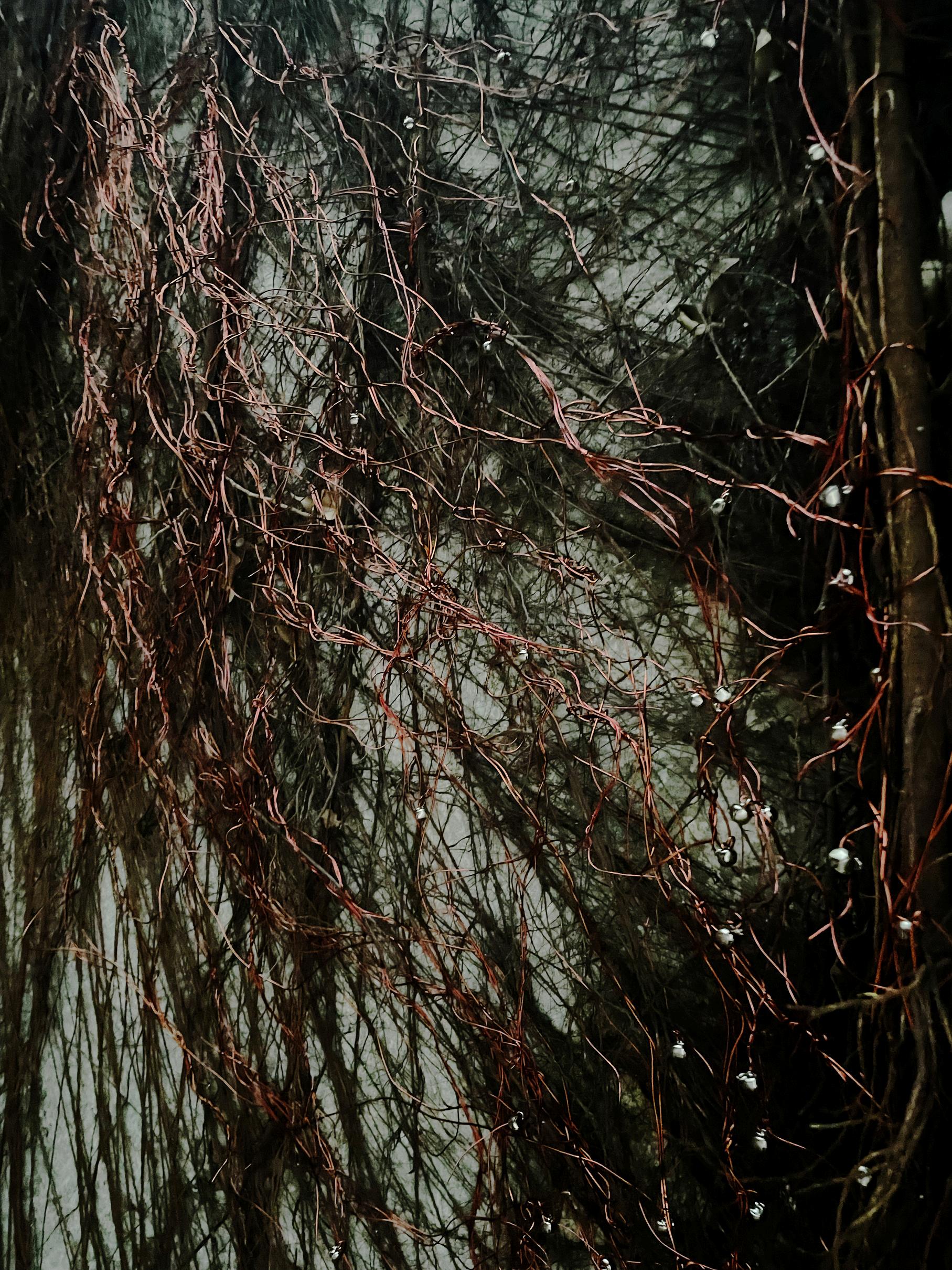 One of the patio’s remaining walls is almost entirely covered and subdued by these roots. Corinne jams this network with copper wires, interrupted by tiny bells, like some ancient warning device that registers the passing wind, tremors, or the presence of a bird or a predatory cat. As the copper strands disappear into this entangled web, they retain their conductive qualities—much like sentient antennas activated by heat or moisture and sensitive to signals that can be harnessed to trigger sound. Elsewhere in the garden, birdcalls tuned to specific frequencies could be heard, subtly modulated to amplify their healing potential.