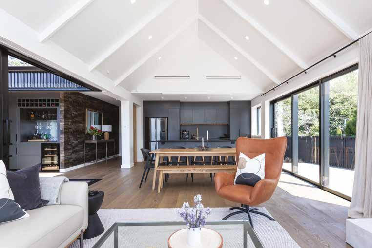 The home has pitched roofs elevating the sense of space in the main living area with vaulted ceilings and exposed rafters while maximising the space for a second level to the back of the property where a workspace and guest area is housed.