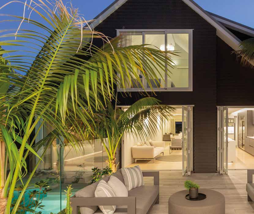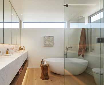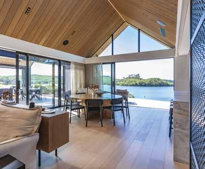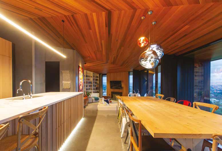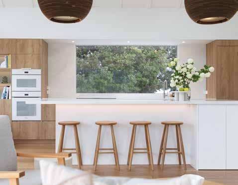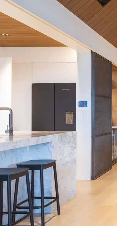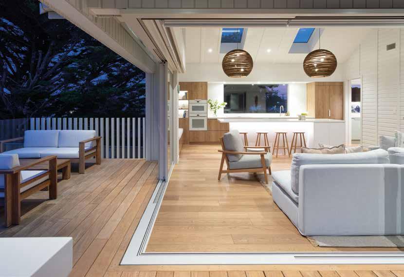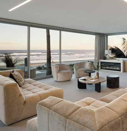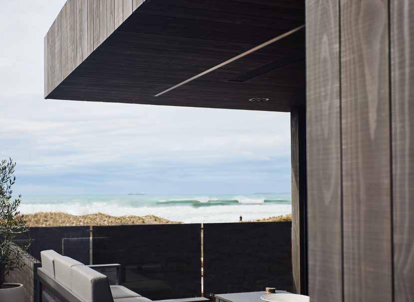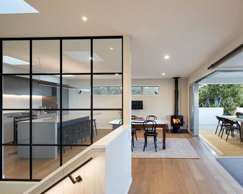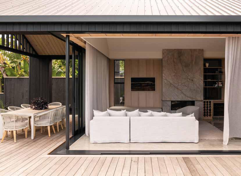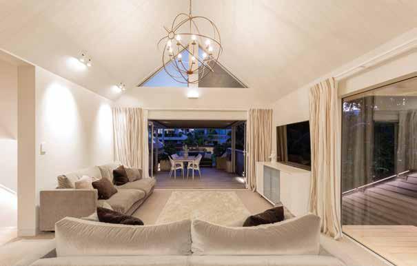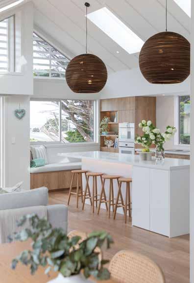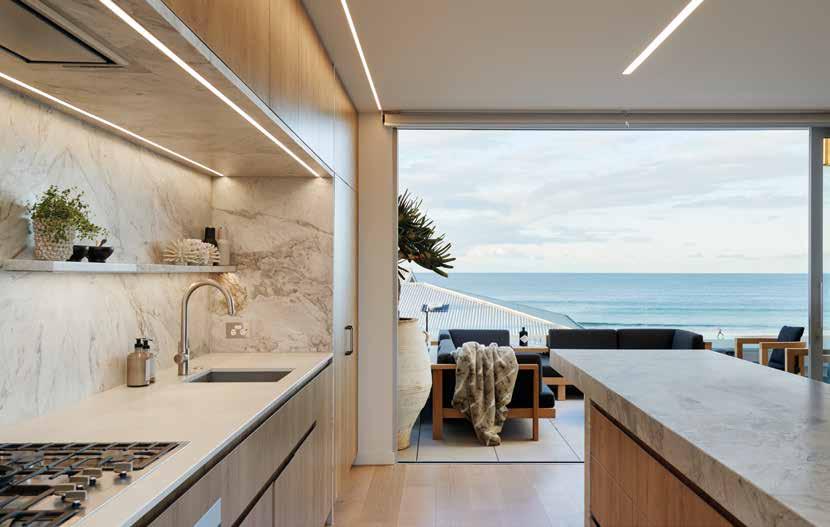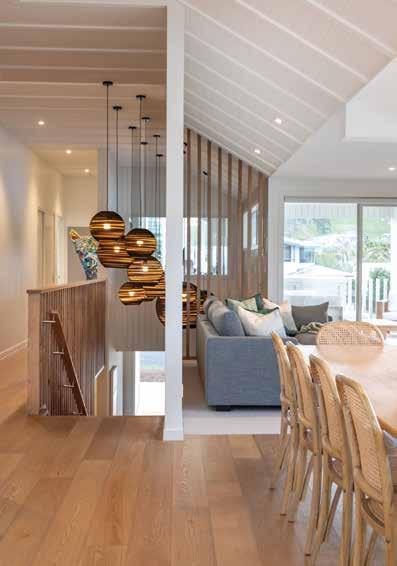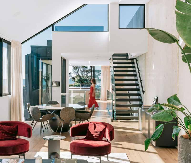 On the main living level, open-plan spaces are designed for relaxed coastal living — with large skylights and floorto-ceiling sliders that invite in natural light and open out to cantilevered decks that capture breathtaking ocean views. Whether hosting or unwinding, these elevated outdoor zones are an extension of the interiors.