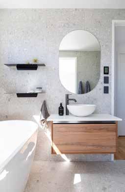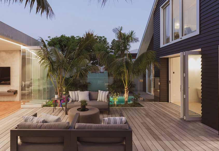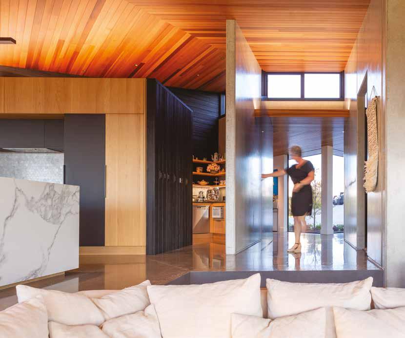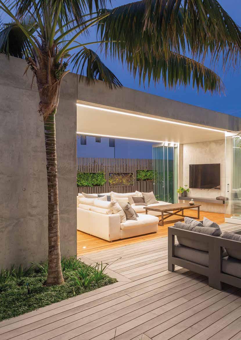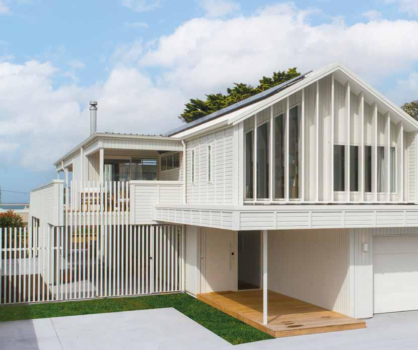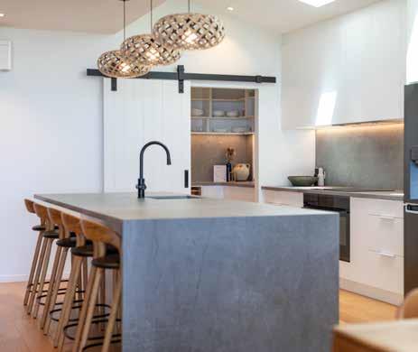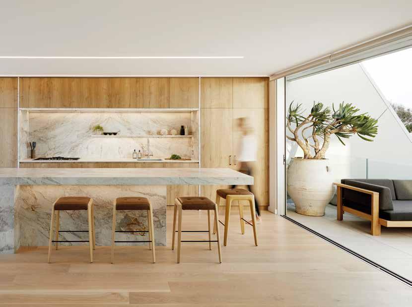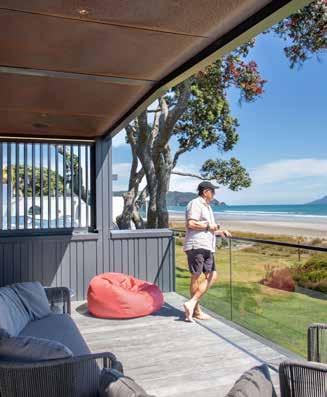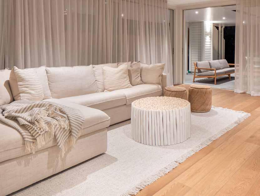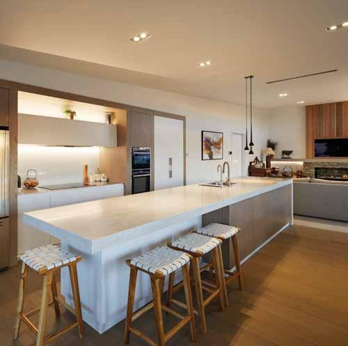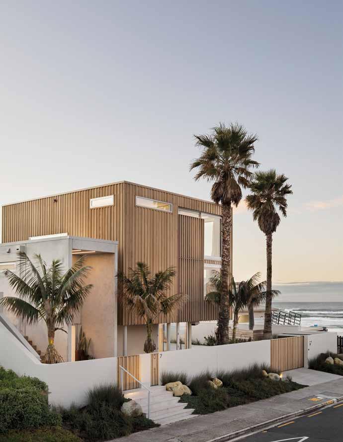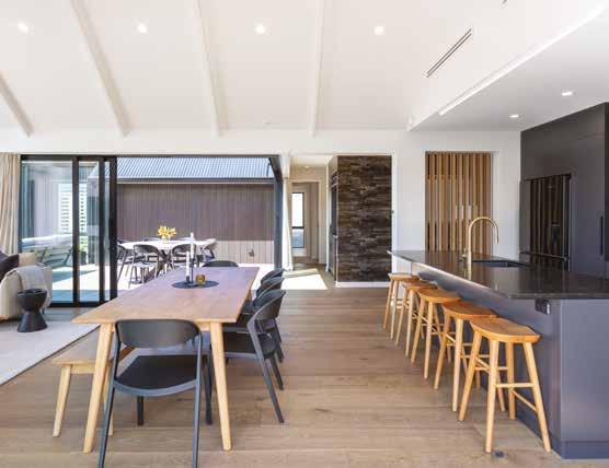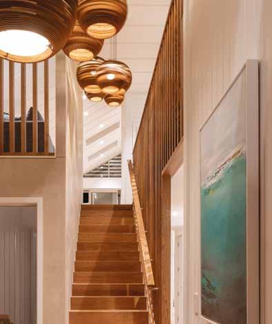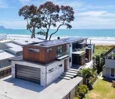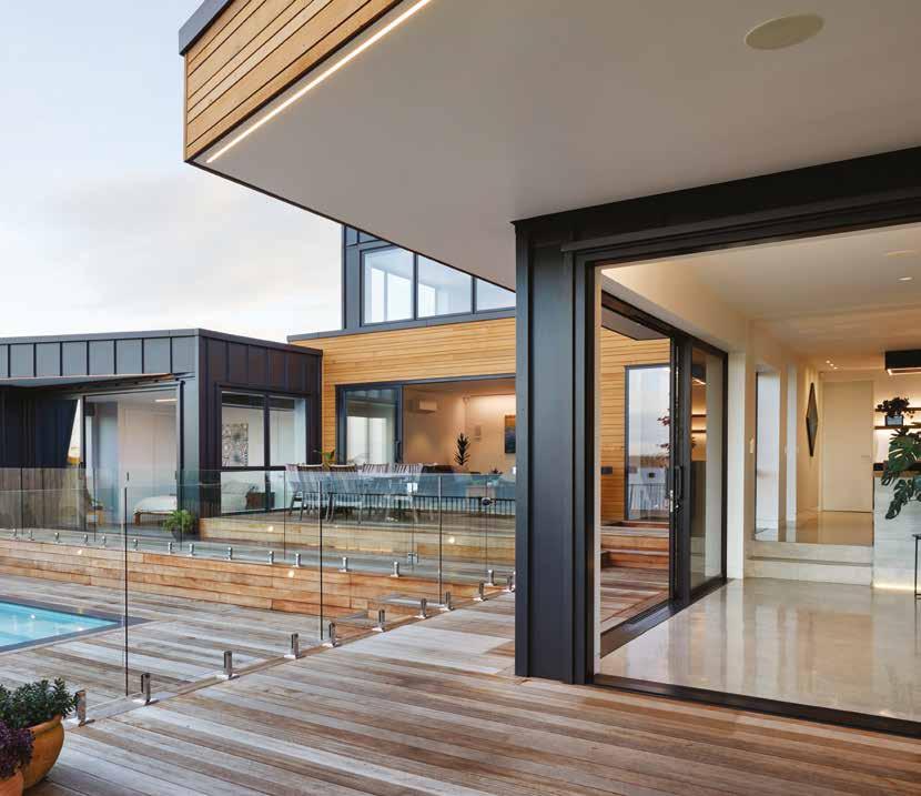On the main living level, open-plan spaces are designed for relaxed coastal living — with large skylights and floorto-ceiling sliders that invite in natural light and open out to cantilevered decks that capture breathtaking ocean views. Whether hosting or unwinding, these elevated outdoor zones are an extension of the interiors.