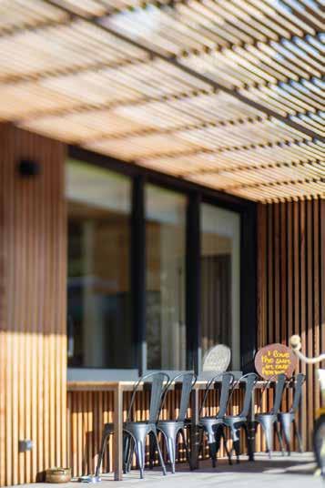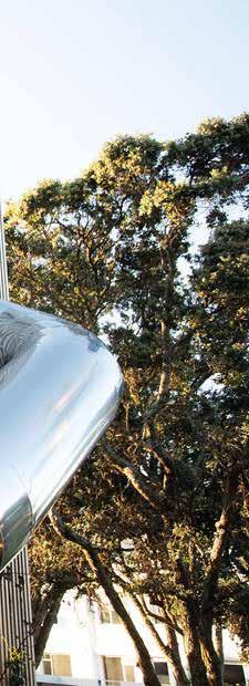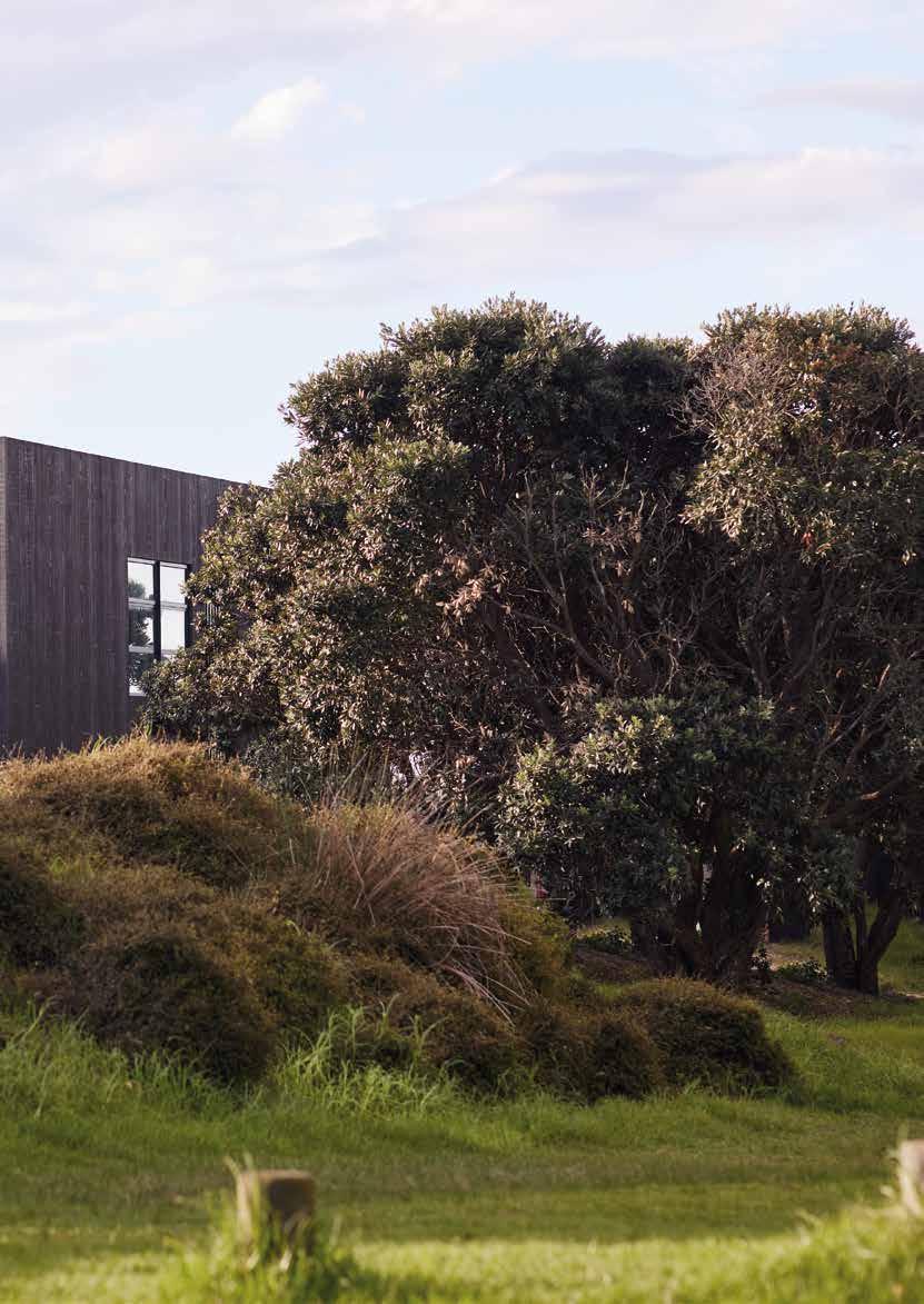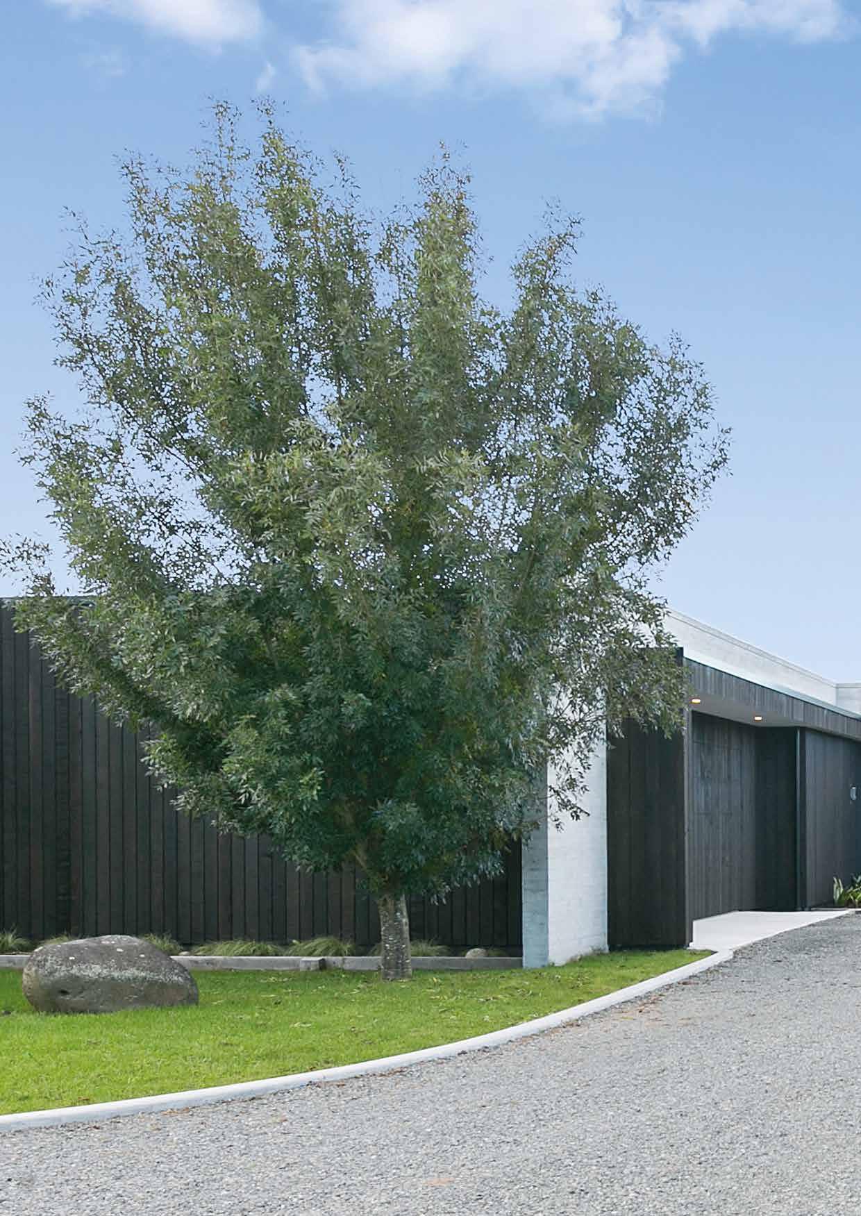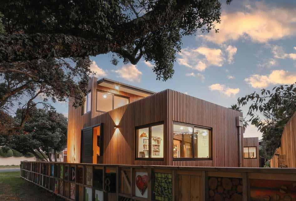 The exterior facade is a removable cedar batten rain screen which enfolds the superstructure, shielding the exterior ply and batten cladding system beneath, while facilitating future maintenance. On the eastern road frontage a local artist was commissioned to paint a Pohutukawa tree immortalising the surrounding trees silhouette, between the cedar battens.