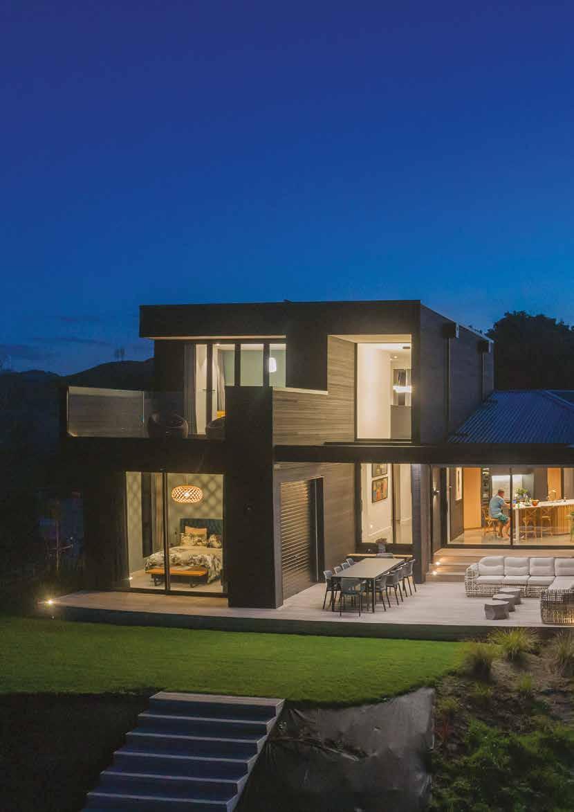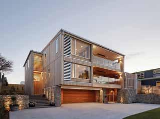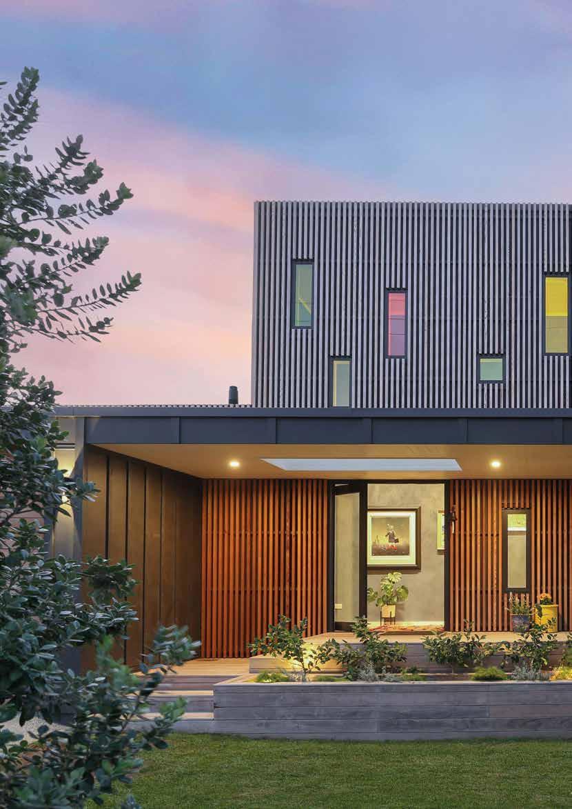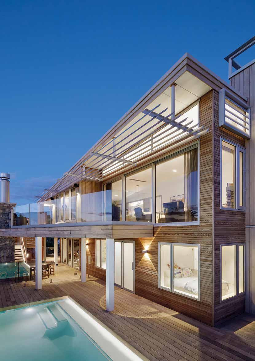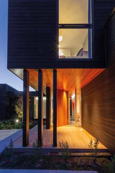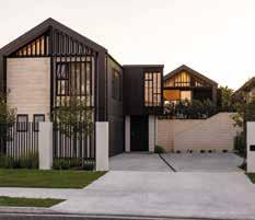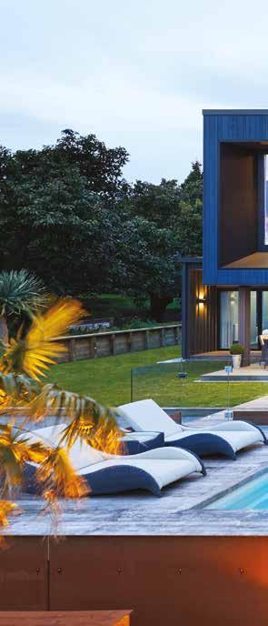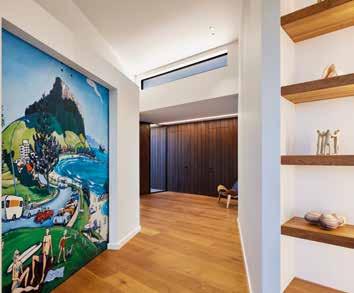 Built in a prime location, set just back from Marine Parade, the home is nestled on a corner surrounded by Pohutukawa trees. While the cedar facade blends sympathetically with the surrounds, the exterior facade is punctuated with vivid splashes of yellow, green, and redhued glass windows, mirroring the owners brief for a zesty lemon, lime, and raspberry colour scheme.