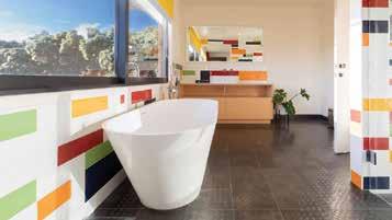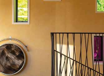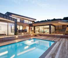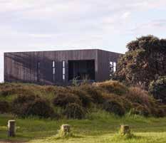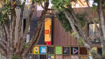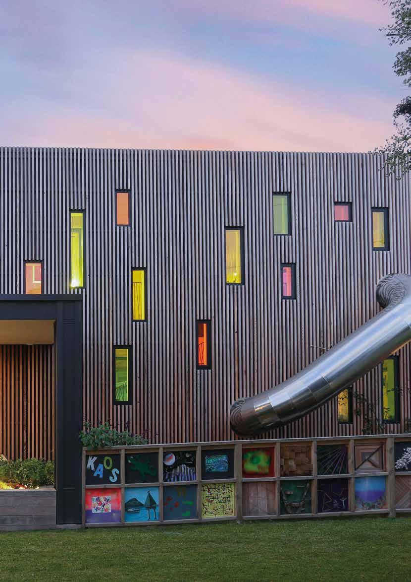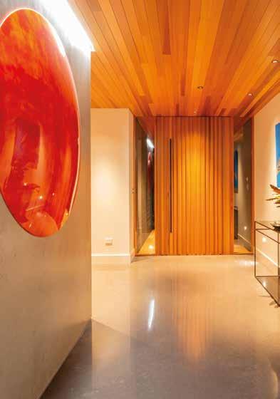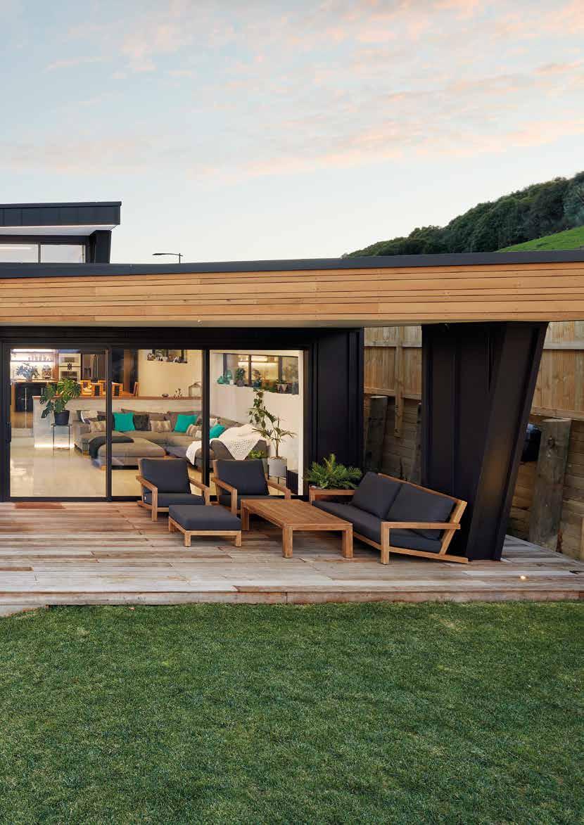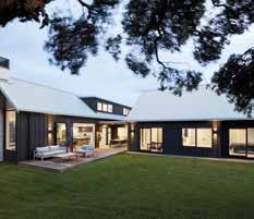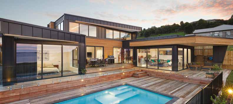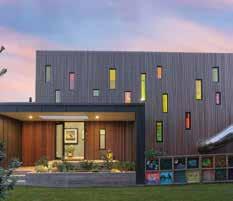 Built in a prime location, set just back from Marine Parade, the home is nestled on a corner surrounded by Pohutukawa trees. While the cedar facade blends sympathetically with the surrounds, the exterior facade is punctuated with vivid splashes of yellow, green, and redhued glass windows, mirroring the owners brief for a zesty lemon, lime, and raspberry colour scheme.