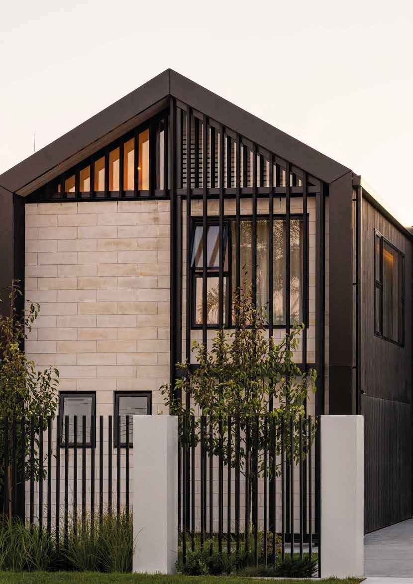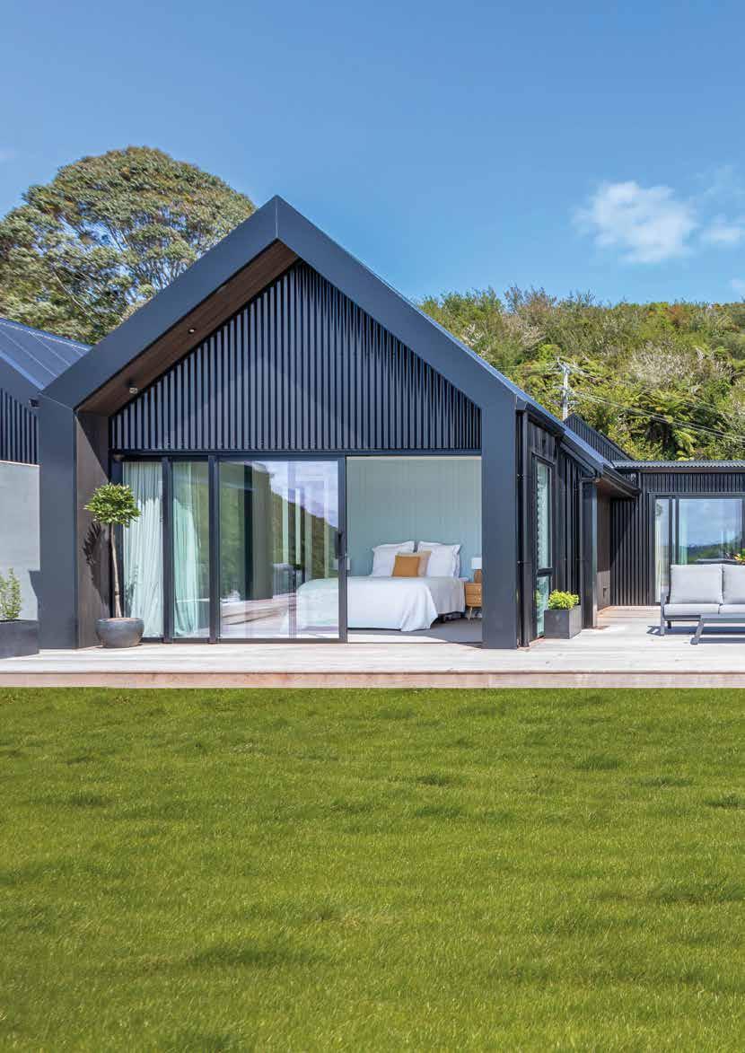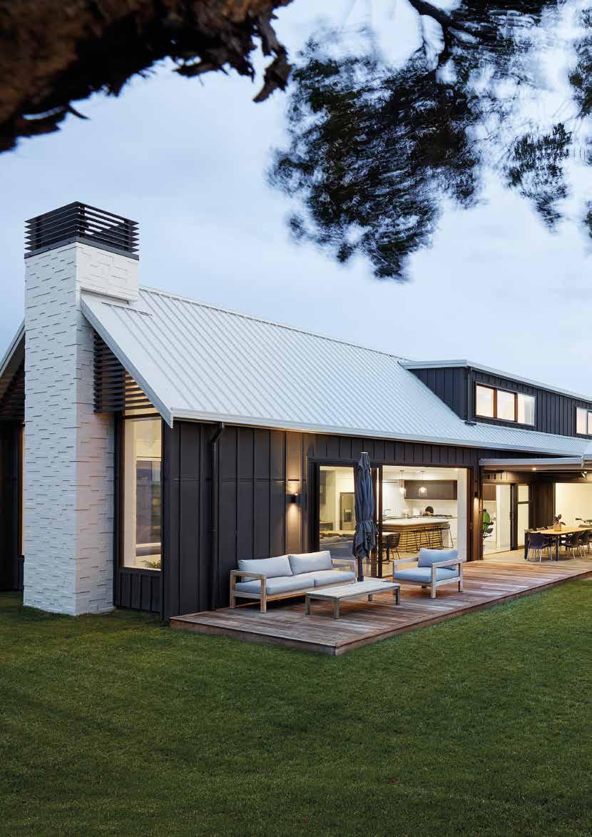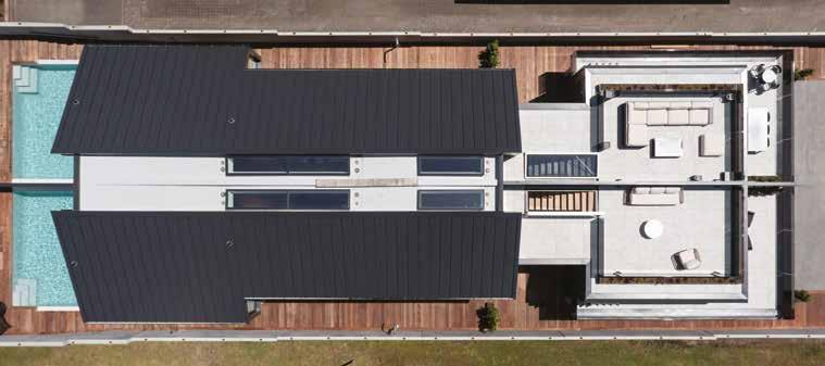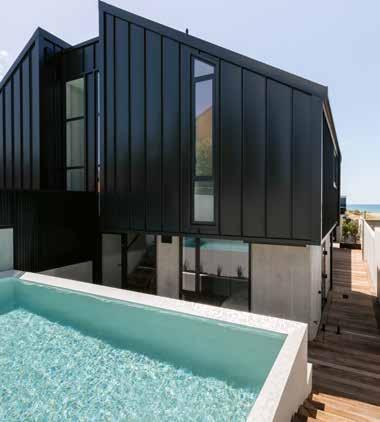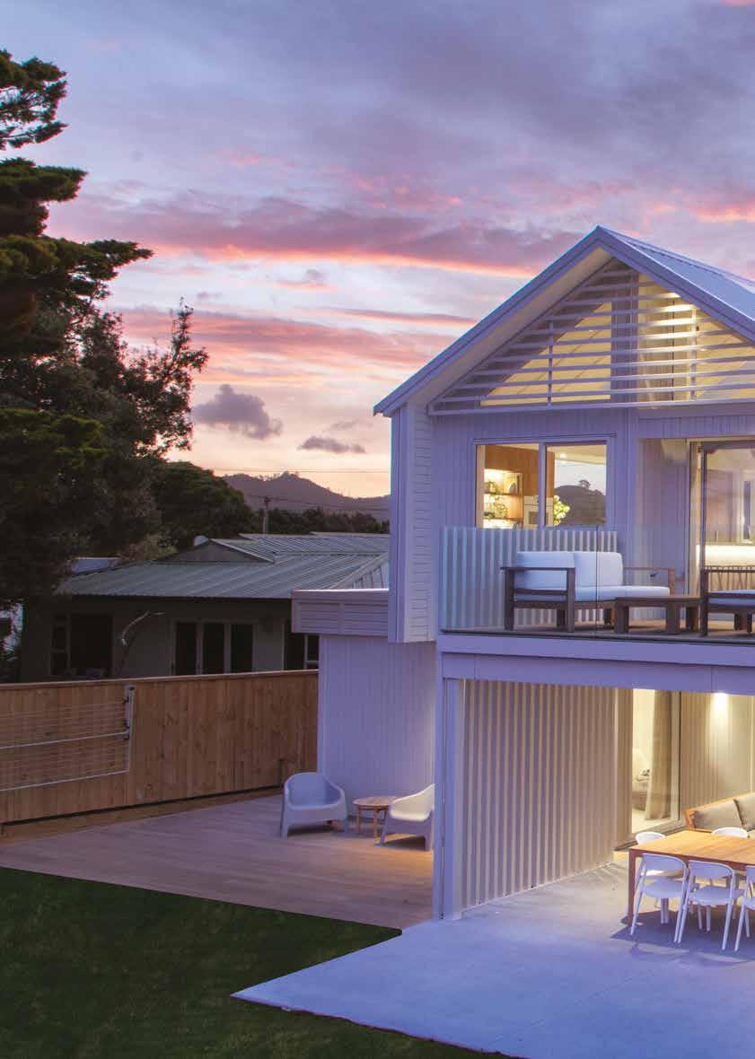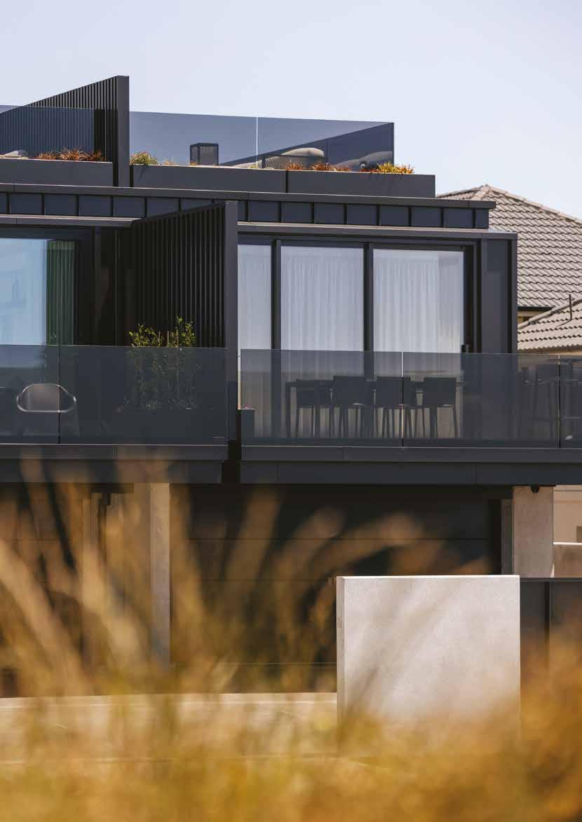 Exteriors are sleek and refined, exuding strength from materials that perform in this coastal location. Pre cast concrete panelling anchors the build with Colorsteel tray cladding creating interest and definition, accentuating the angular roofline of the two properties.
