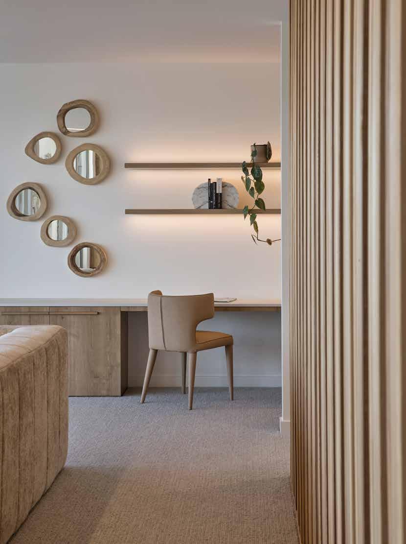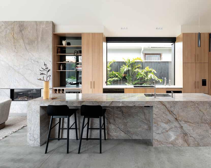 The interiors are driven by the location of the home, with the natural lake environment inspiring an organic palette of stones, marbles, timbers, and wool carpets. ‘Charleston stone from the West Coast of New Zealand was used in two combinations of dry stack lay on the chimney, and horizontal cut crazy pave flooring in the entry and outdoor portico floor,’ explains Johnny.