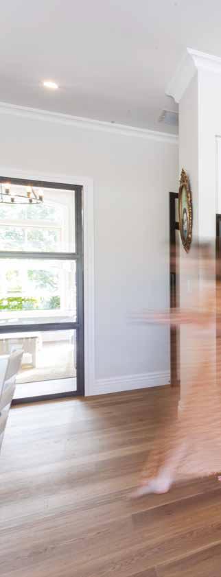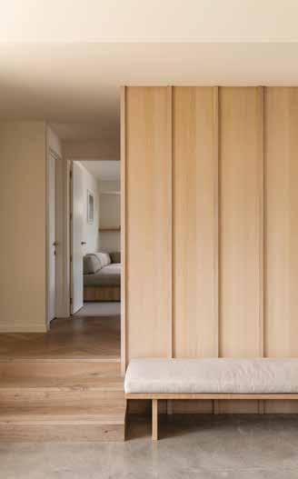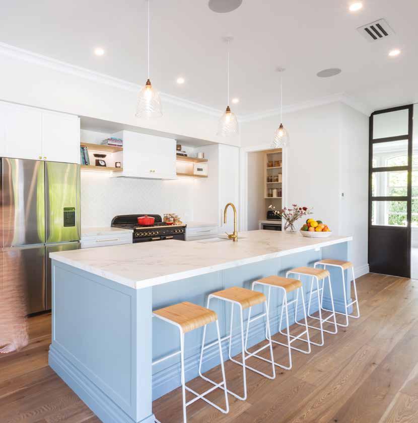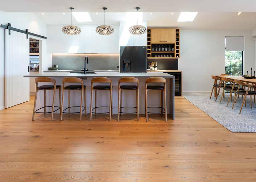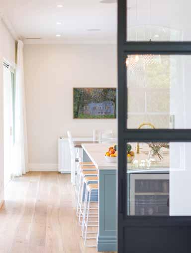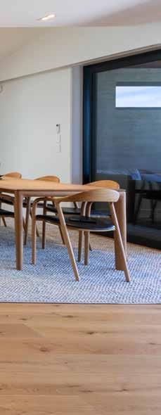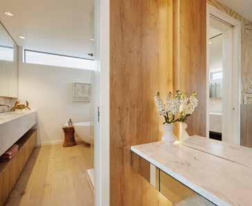 Timber panel walls with detailing and white American oak hardwood floors throughout the living spaces, add a timeless element that, when combined with the high ceilings and the grey-blue and soft white tones creates a relaxed feel.