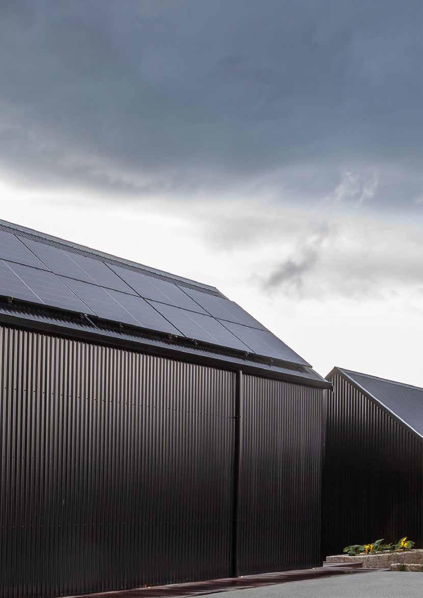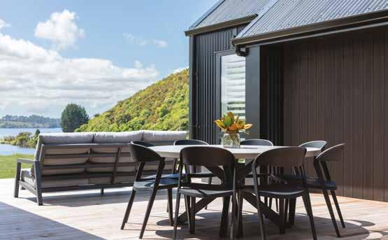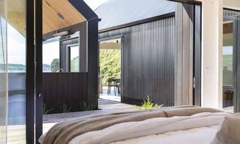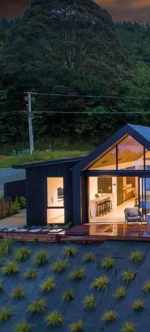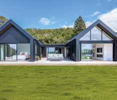 Inspiration for the home’s architecture was taken from the concept of an old, lake edge corrugated iron boat shed. The new buildings have 40-degree pitch gable forms that waterfall down and anchor the buildings to the site. Both this home and the neighbouring home were designed to complement the surroundings, and the dark exteriors help them blend into the surrounding hills covered in native plants. Eco-conscious steps were taken including installing a full solar system, and recycling the sites stormwater which discharges into the lake before it is re-filtered into the domestic water system within the house.