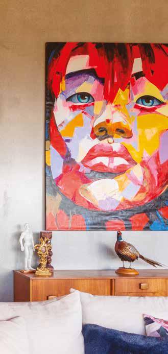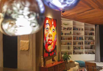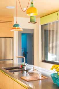 Artistry extends to the kitchen, where bold colours are interjected against the ply finished cabinets while above the central island, feature light shades, fashioned from reclaimed washed-up beverage bottles, illuminate the heart of this culinary space.