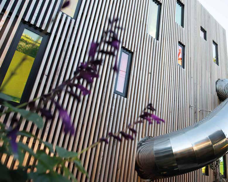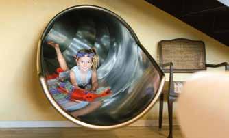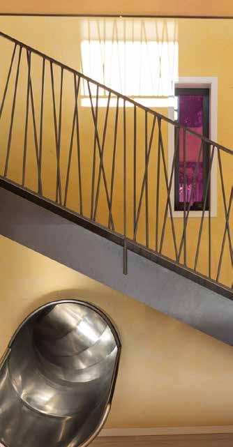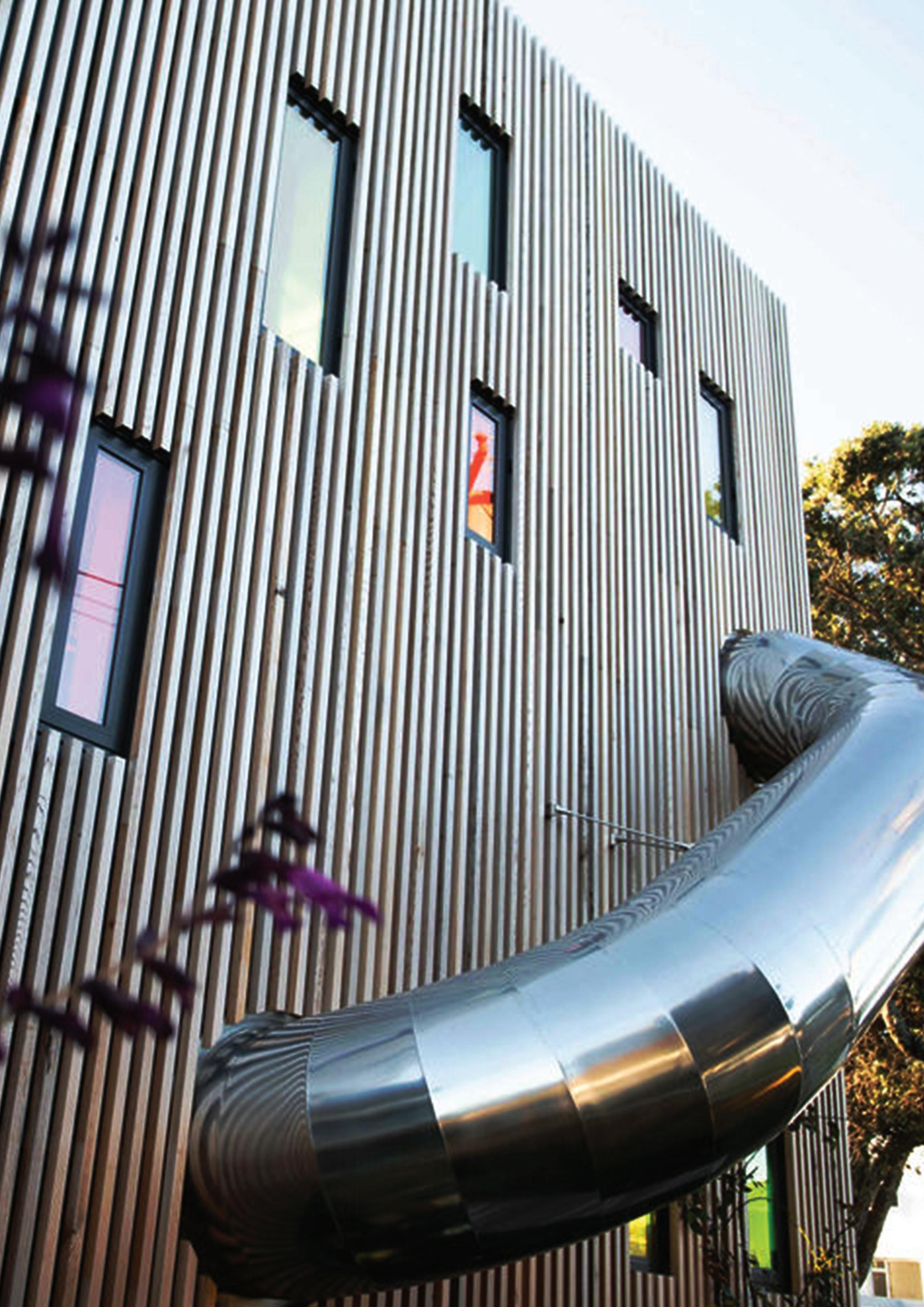 A striking custom slide, winds its way from the upper floor to the lower, inviting residents to embark on a whimsical descent and creating interest and awe from the street