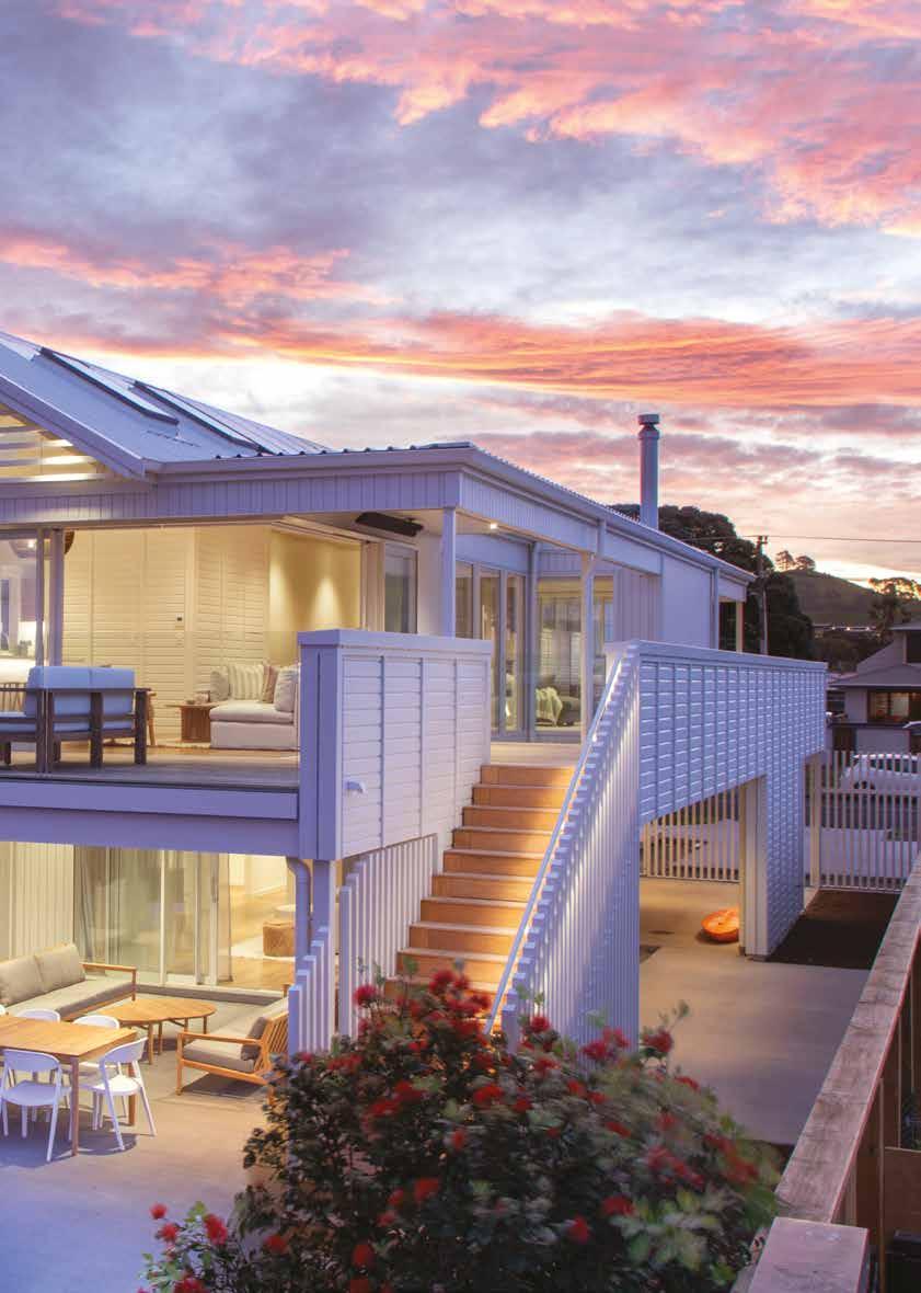 In a prime Mount Maunganui location set just back from Marine Parade, this playful home blends in with the iconic Pohutukawa trees on the street, being both striking and sympathetic of the streetscape.