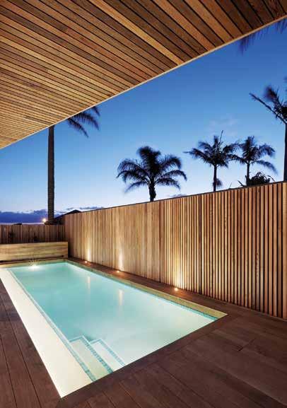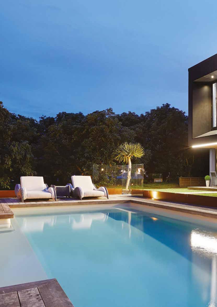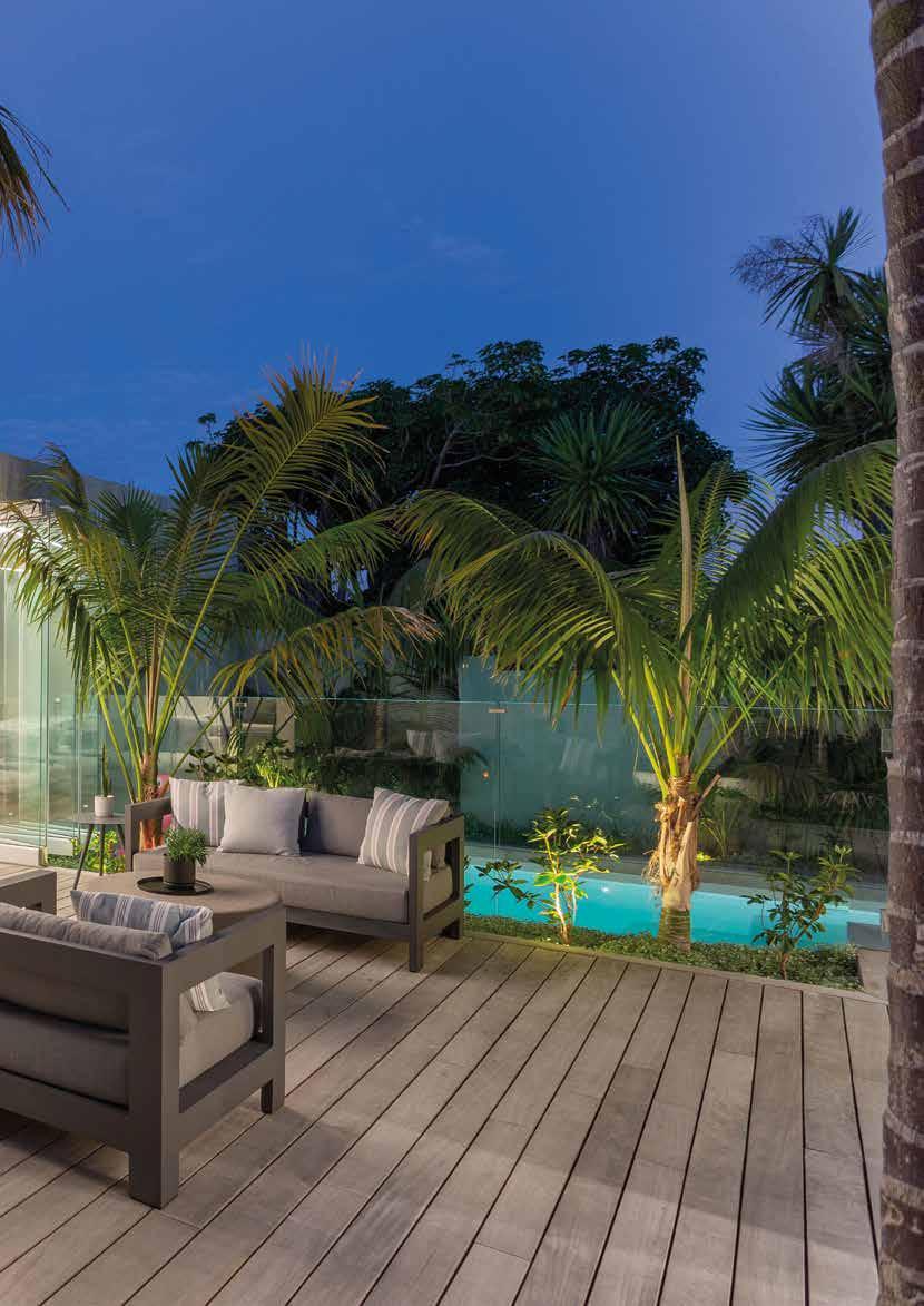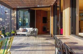 The new alfresco entertaining area features 200m² hardwood decking and an integrated audio and AV system that connects to the interiors. To maximise the use of the outdoor area year round, the space also includes an open fire and the swimming pool is heated.