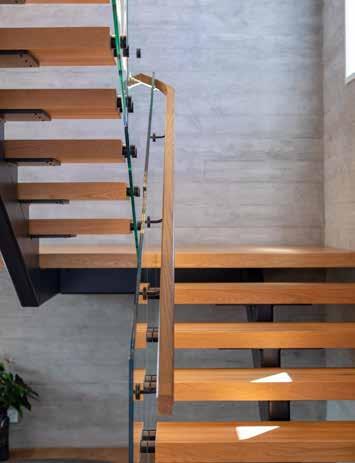Throughout the home, the interplay of materials is both robust and refined. The internal concrete walls mirror the exterior, while the floating stringer staircase with hand-carved wooden handrails lends a bespoke touch, illuminated by recessed LED lighting highlighting this central sculptural element.