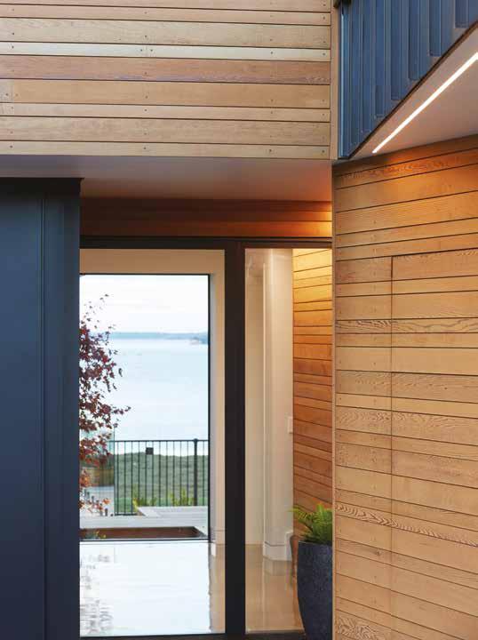 Striking in concrete and contrasting cedar, this home’s definitive exterior is a 90-degree angled facade that extends the full length of the two sides of the home’s entry elevation.
