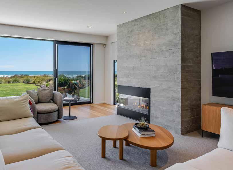 Anchoring the lounge space is a striking board-formed concrete wall, housing a fireplace—a cosy focal point for winter days spent steps away from the beach. The ground floor also includes a scullery, master suite with ensuite, a utility room, and a powder room, all designed with function and comfort in mind.