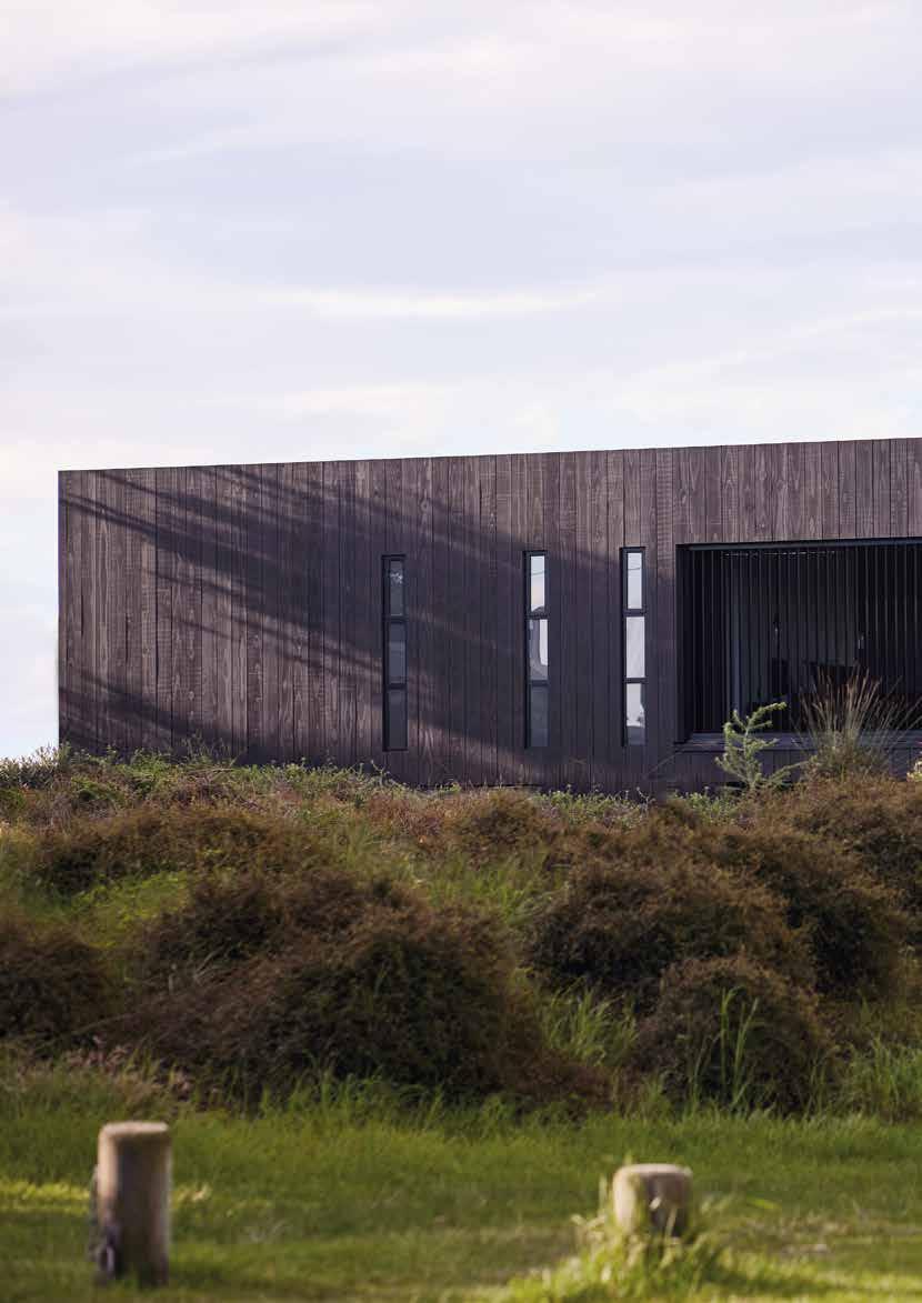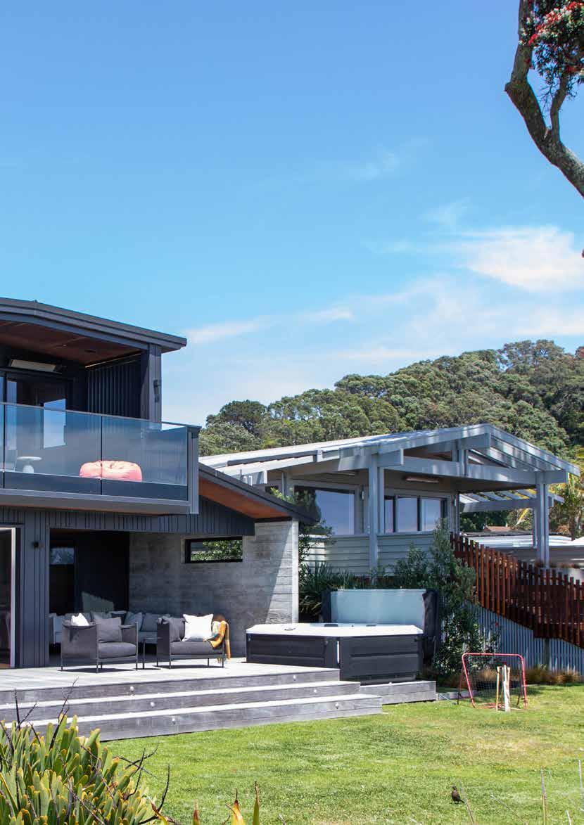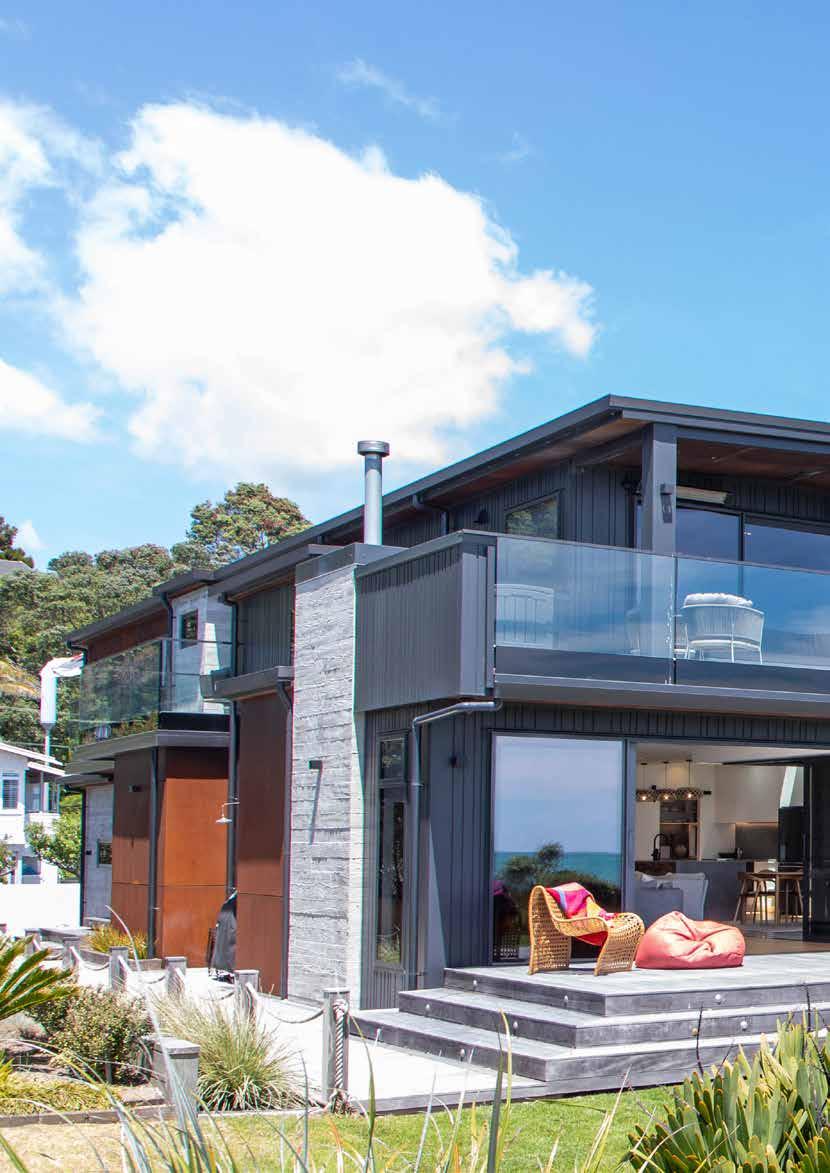 Finished in a charcoal cedar ply and cedar batten the home is in keeping with the relaxed beach environment and softened by the established Pōhutukawa which borders the section.