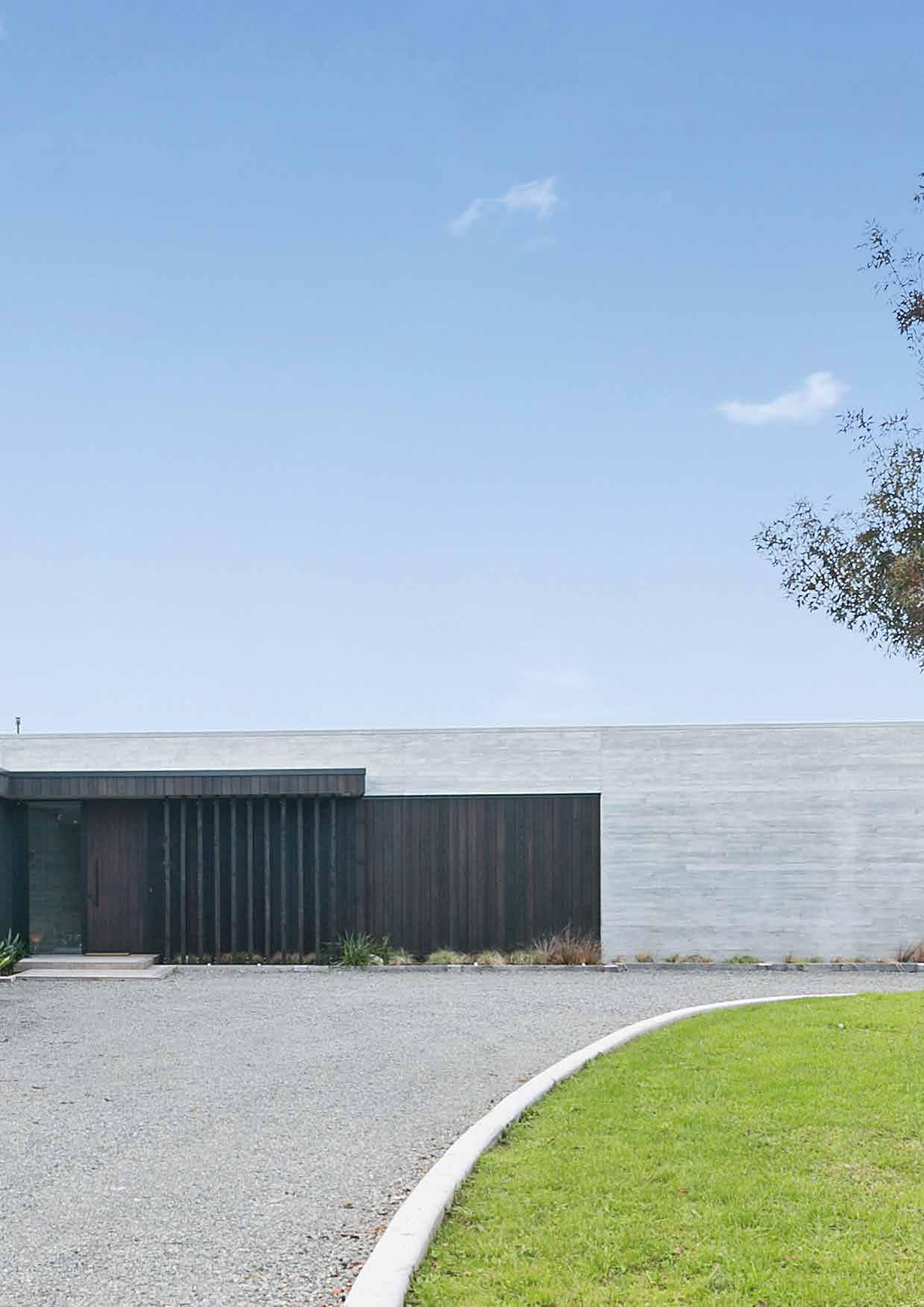 Two central spines of exposed concrete run from the exterior and anchor the interior of the home. These spine walls are created from in situ board-form concrete and the walls have a timber grain finish. The architectural concrete was both structurally and aesthetically critical to the integrity of the home’s design.