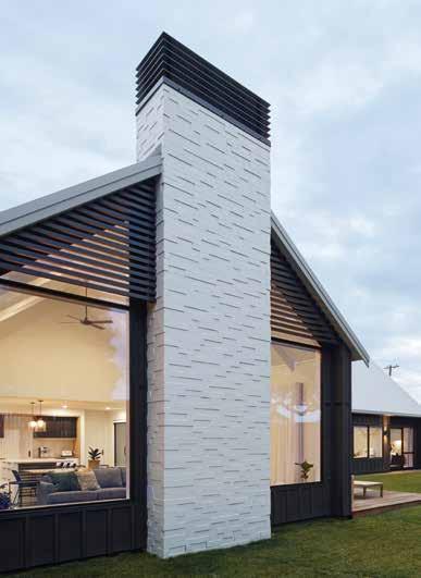 A chimney, which is built from brick and stagger laid, contrasts against the dark exterior in white and is finished with an aluminium finn chimney cap. Designed as two wings the home takes the shape of an L to master family play and family privacy and make the most of the established section.