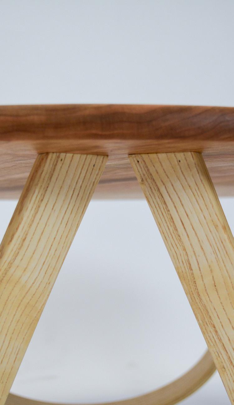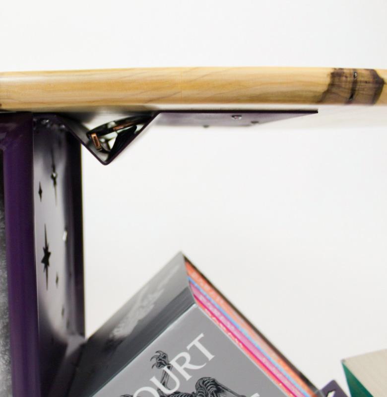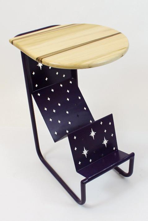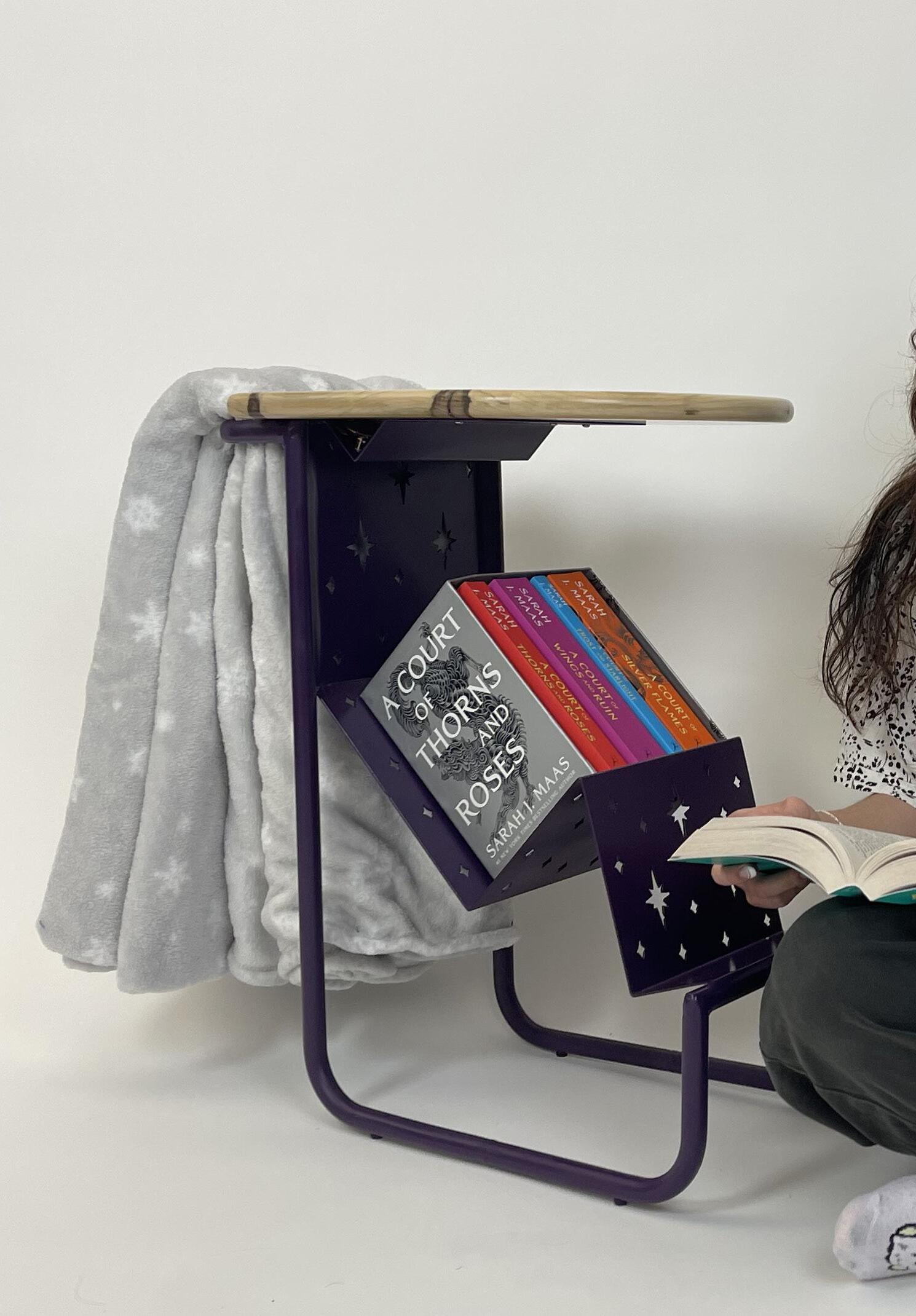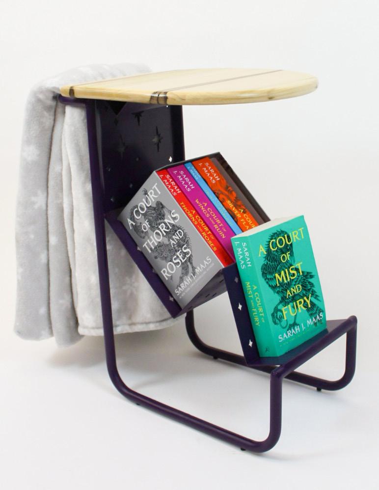 Eclipse, inspired by the ACOTAR book series, combines the mystery and radiance of each book’s important symbols through mountain-shaped sheet metal, laser-cut stars, and a sun-inspired tabletop. Functional features include a dualpurpose handle for portability and blanket storage, a glasses holder, and book storage.