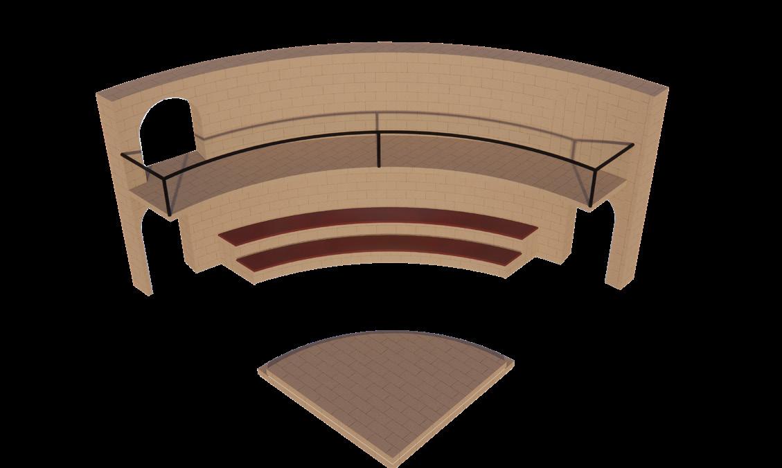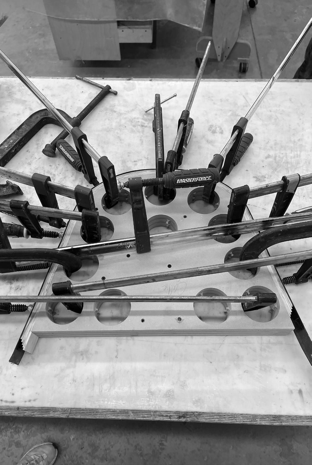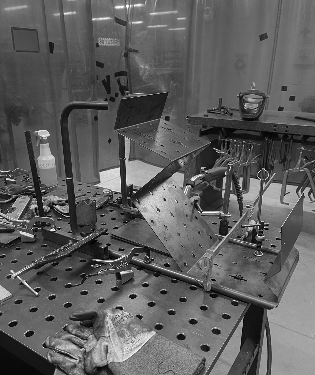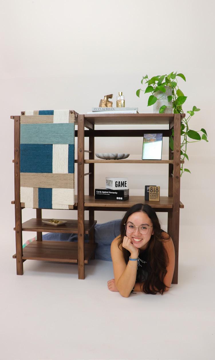 Eclipse, inspired by the ACOTAR book series, combines the mystery and radiance of each book’s important symbols through mountain-shaped sheet metal, laser-cut stars, and a sun-inspired tabletop. Functional features include a dualpurpose handle for portability and blanket storage, a glasses holder, and book storage.