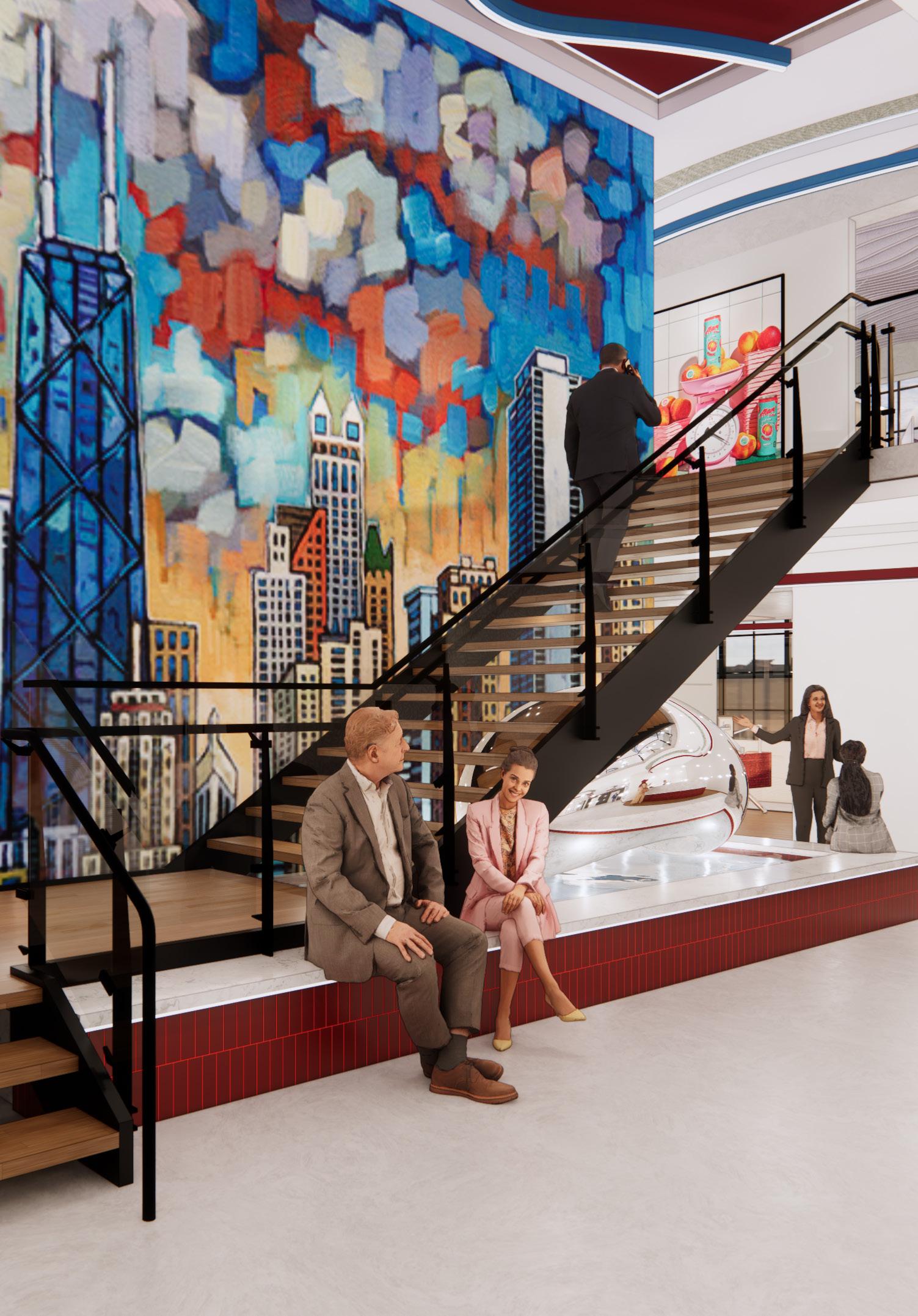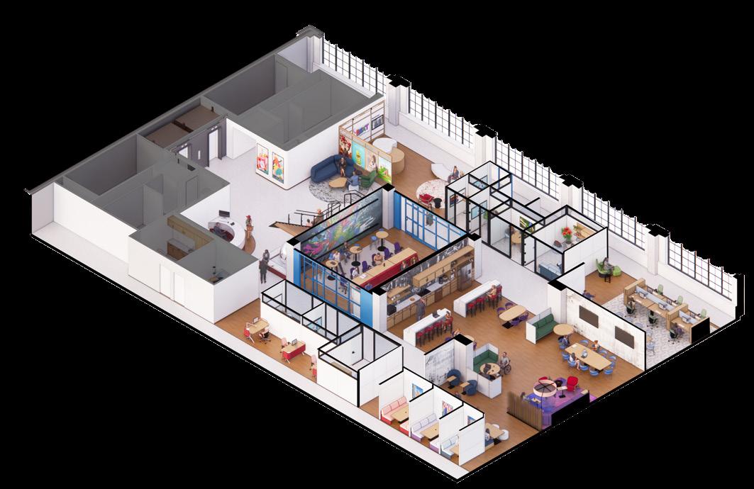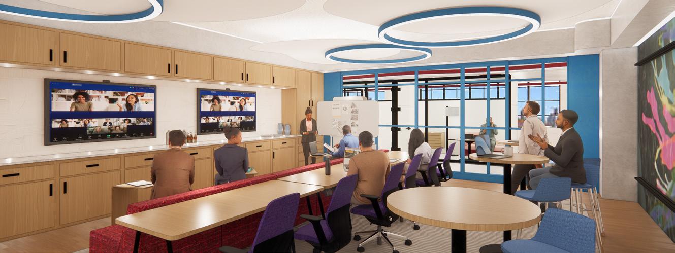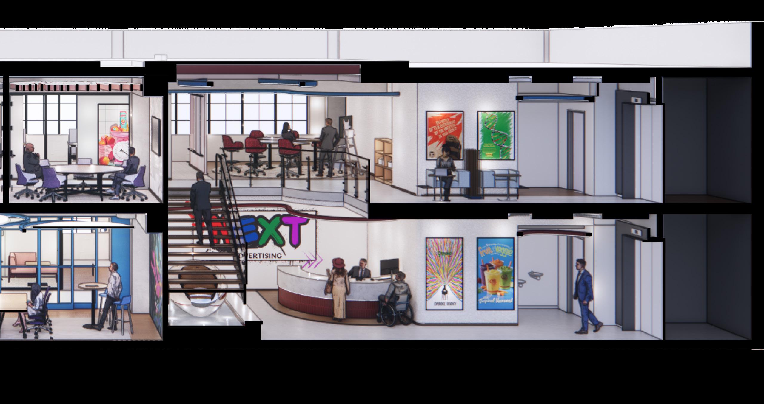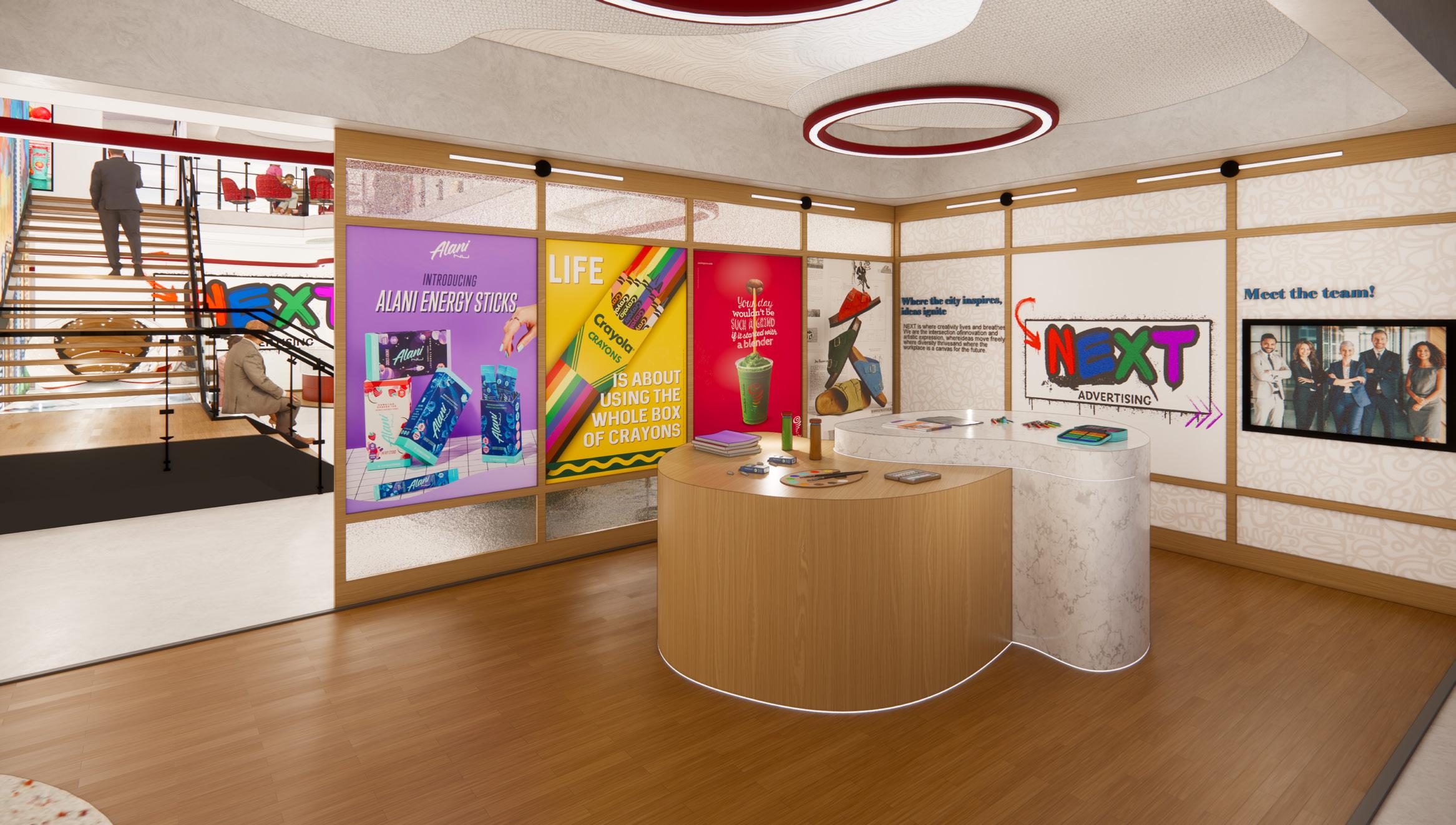 The inspiration for Next Advertising comes from the vibrant energy of Chicago’s art scene, where the city serves as a living gallery of creativity and expression. The workspace reimagines employees as artists and the office as their canvas, drawing influence from the dynamic neighborhoods of Pilsen and the structured ambiance of The Loop. Collaborative zones feature bold colors, reclaimed wood, spray-painted finishes, and graphic prints to bring the raw vibrancy of street art into the space. These areas are designed to stimulate creativity while providing inclusive solutions, such as sound-absorbing materials and customizable lighting, for diverse sensory needs. Focused zones, inspired by the elegance of The Loop, use neutral tones, polished stone, and ergonomic furniture to create a calm environment that supports deep work. Together, these spaces celebrate artistry, collaboration, and personal well-being, transforming the office into a dynamic hub of creativity and connection