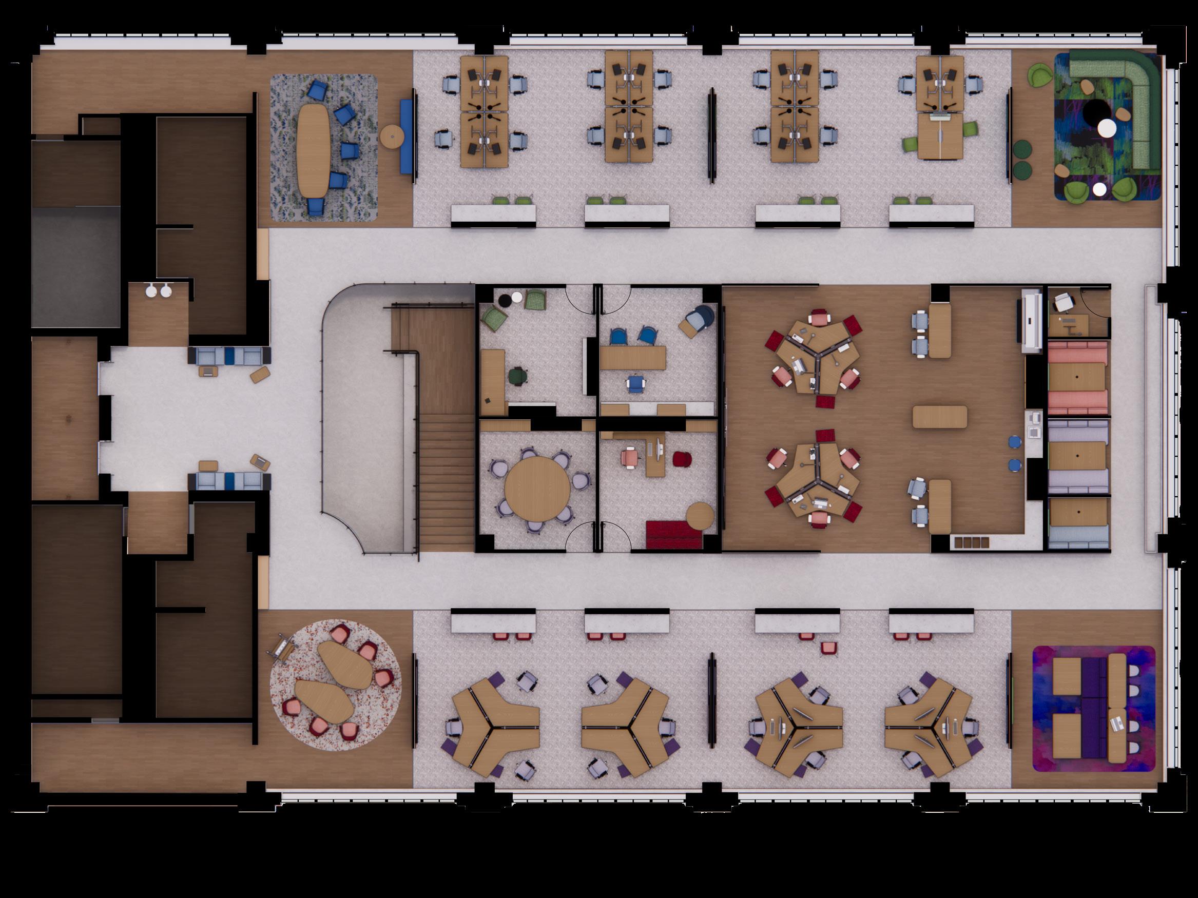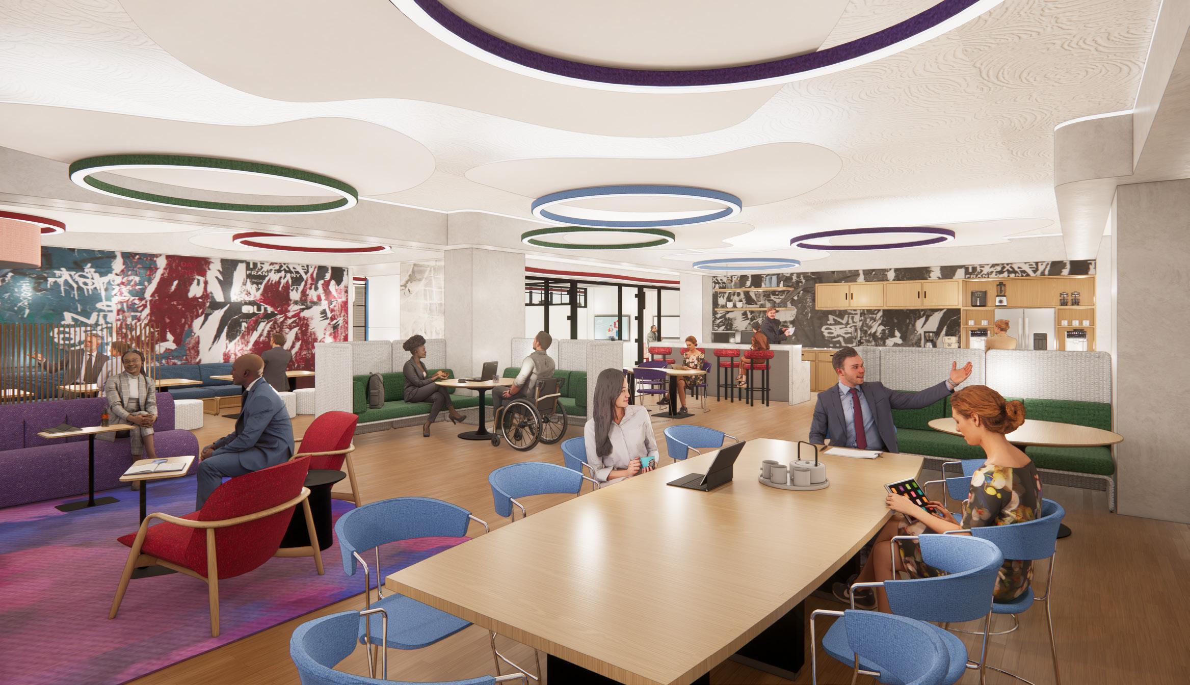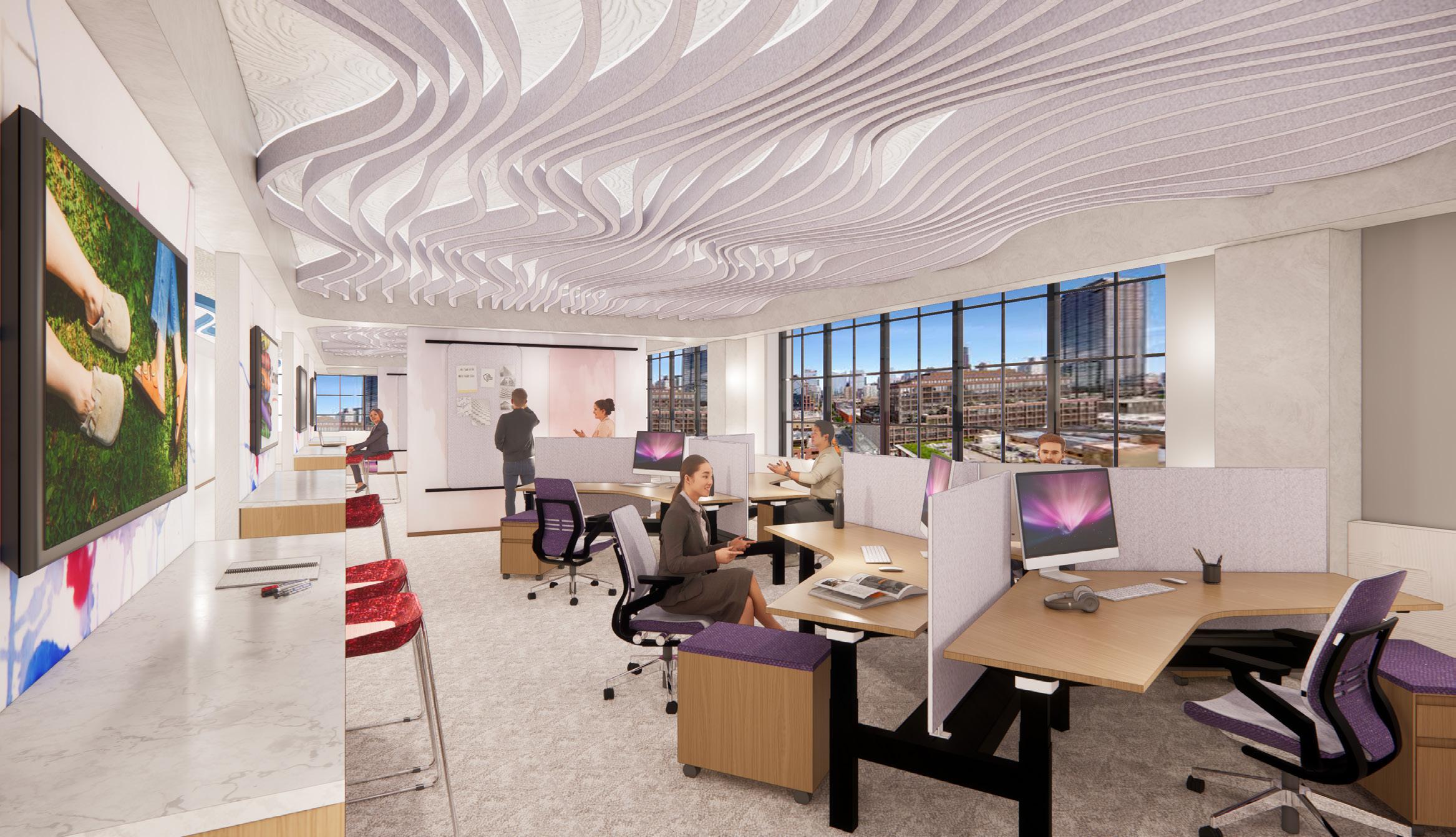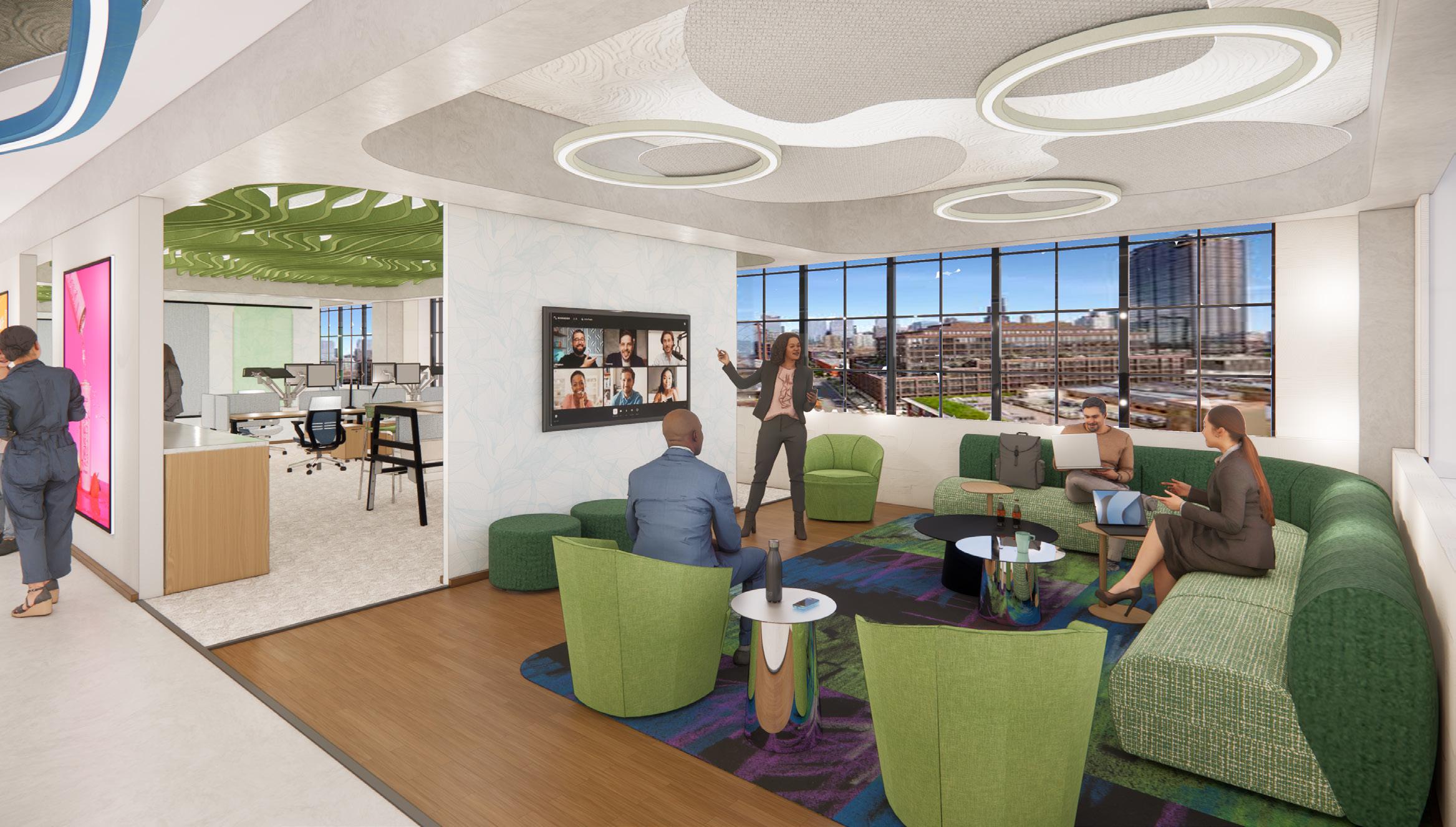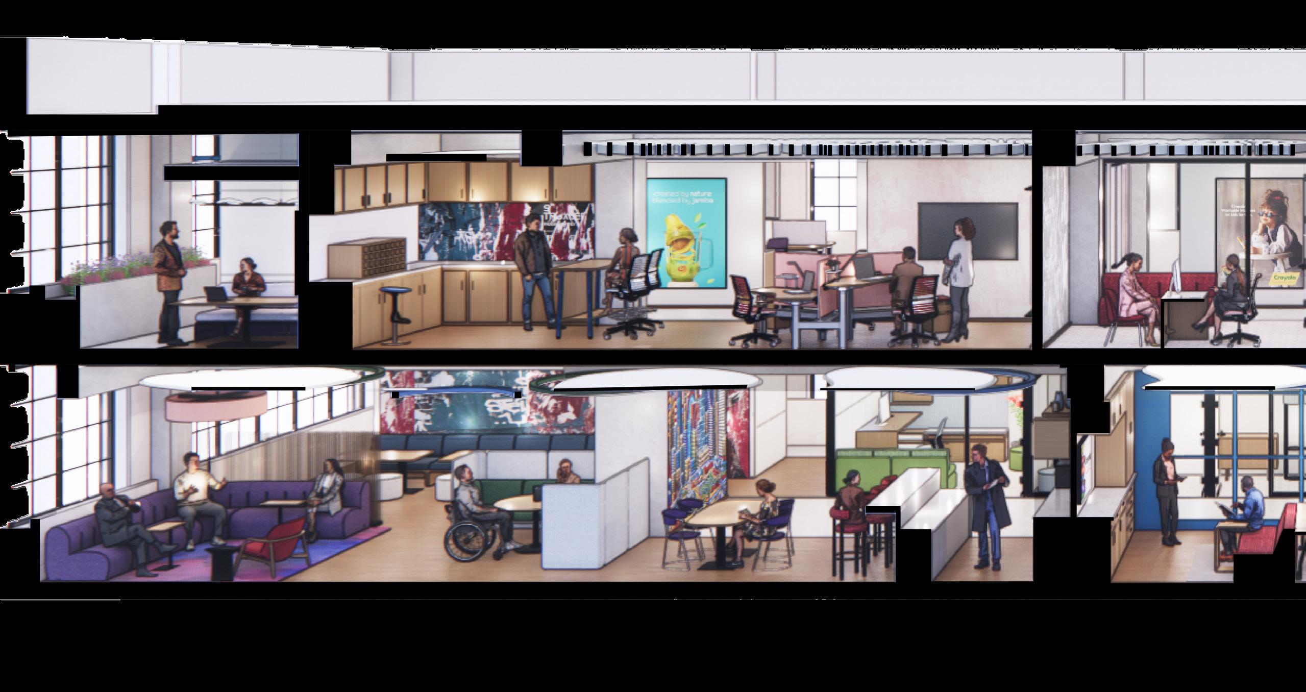 The inspiration for Next Advertising comes from the vibrant energy of Chicago’s art scene, where the city serves as a living gallery of creativity and expression. The workspace reimagines employees as artists and the office as their canvas, drawing influence from the dynamic neighborhoods of Pilsen and the structured ambiance of The Loop. Collaborative zones feature bold colors, reclaimed wood, spray-painted finishes, and graphic prints to bring the raw vibrancy of street art into the space. These areas are designed to stimulate creativity while providing inclusive solutions, such as sound-absorbing materials and customizable lighting, for diverse sensory needs. Focused zones, inspired by the elegance of The Loop, use neutral tones, polished stone, and ergonomic furniture to create a calm environment that supports deep work. Together, these spaces celebrate artistry, collaboration, and personal well-being, transforming the office into a dynamic hub of creativity and connection