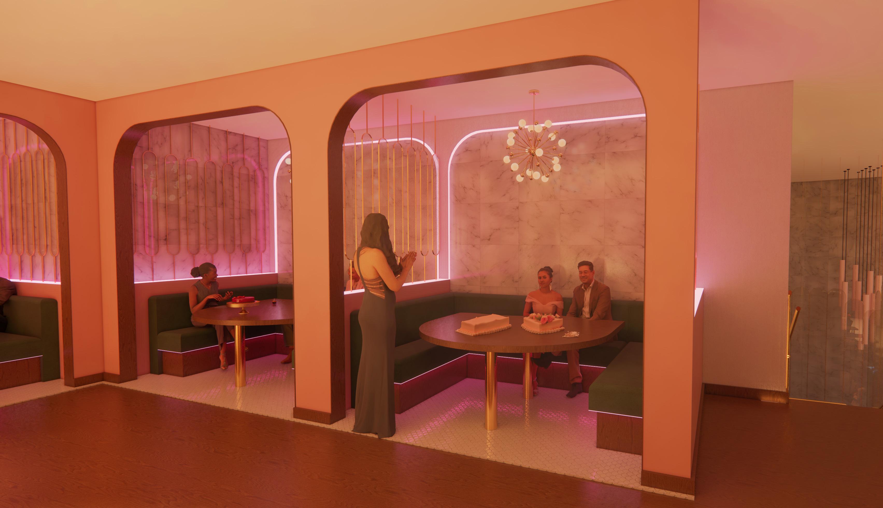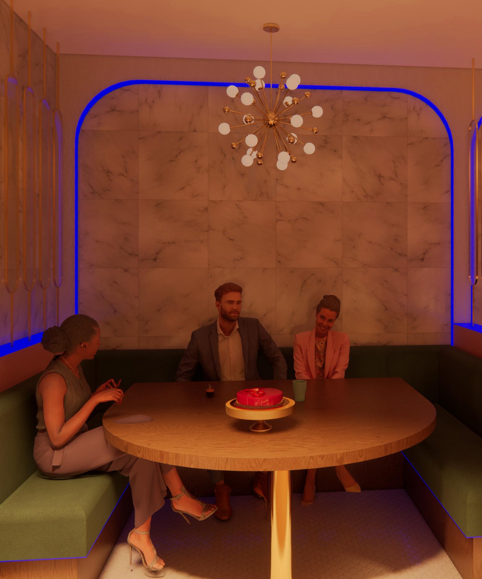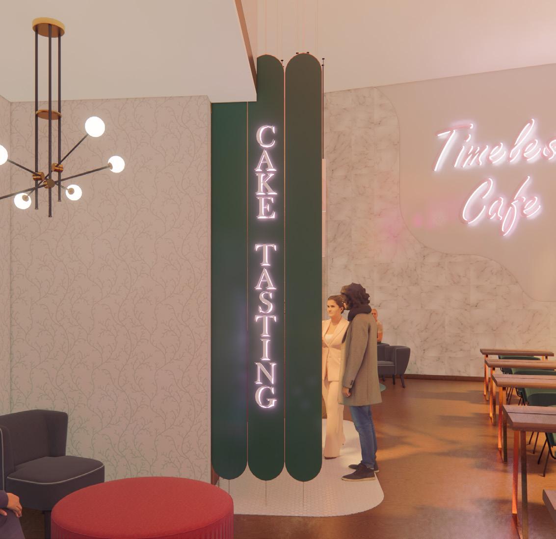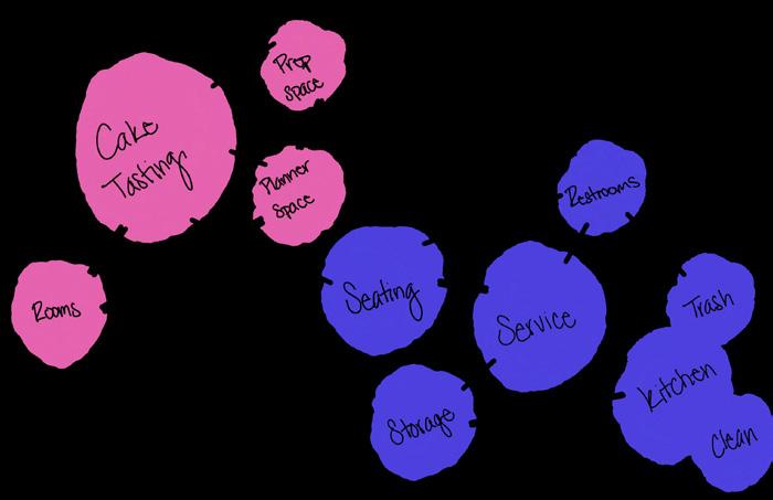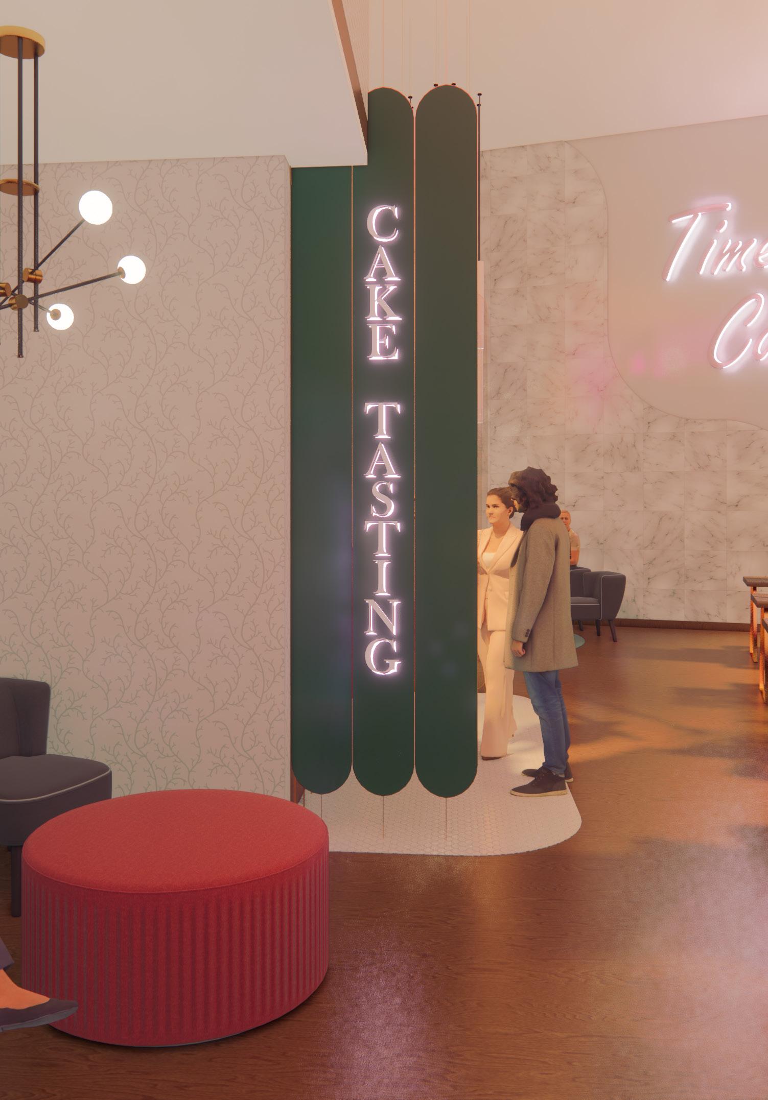 While designing Timeless Cafe, I relied heavily on my mood board to capture the essence of my best friend’s wedding and ensure that I did it justice by evoking the right feeling. I utilized bubble diagrams and sketching for spatial planning, focusing specifically on designing booths for cake tasting to create a unique experience that honors the celebratory spirit of the event.