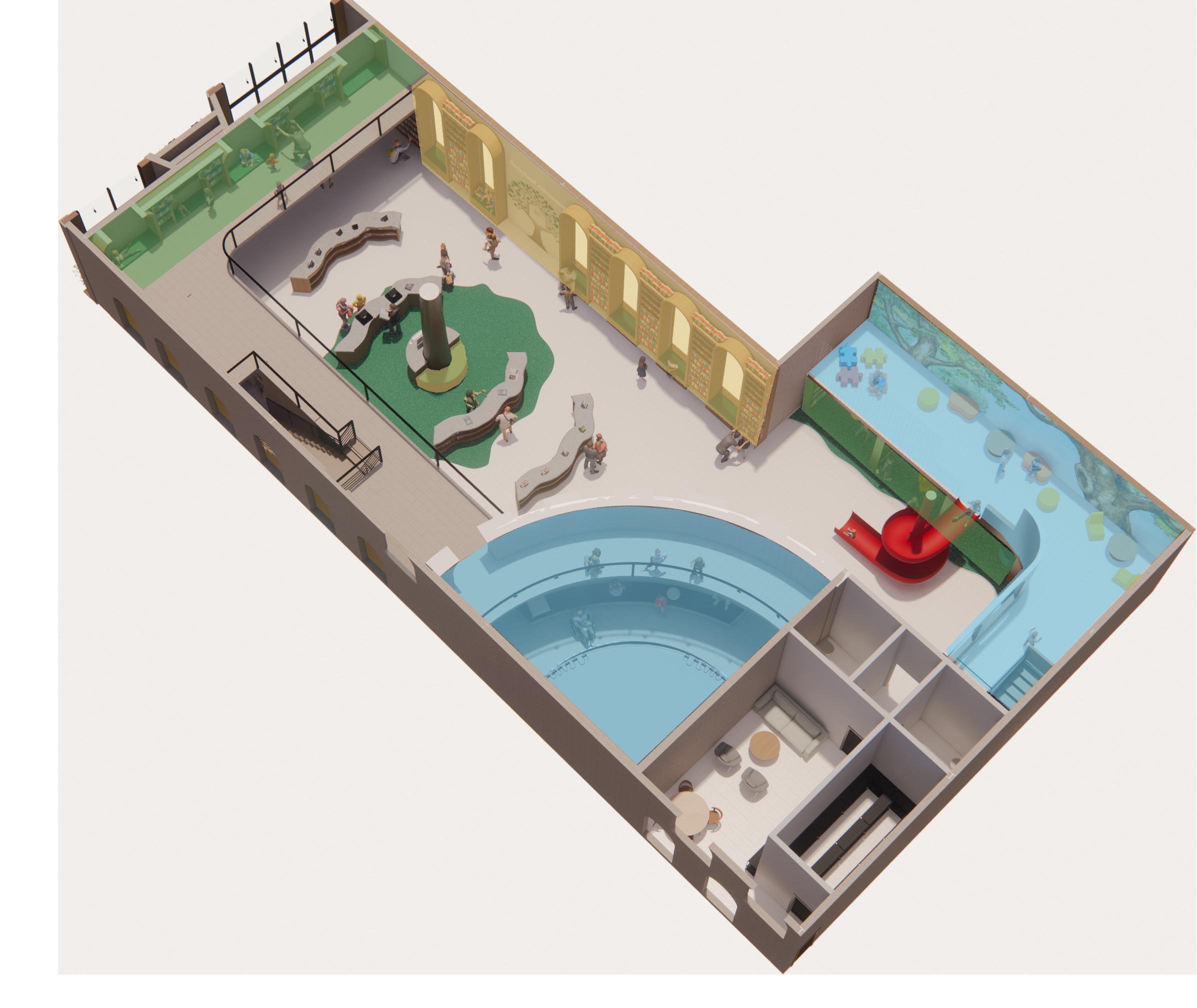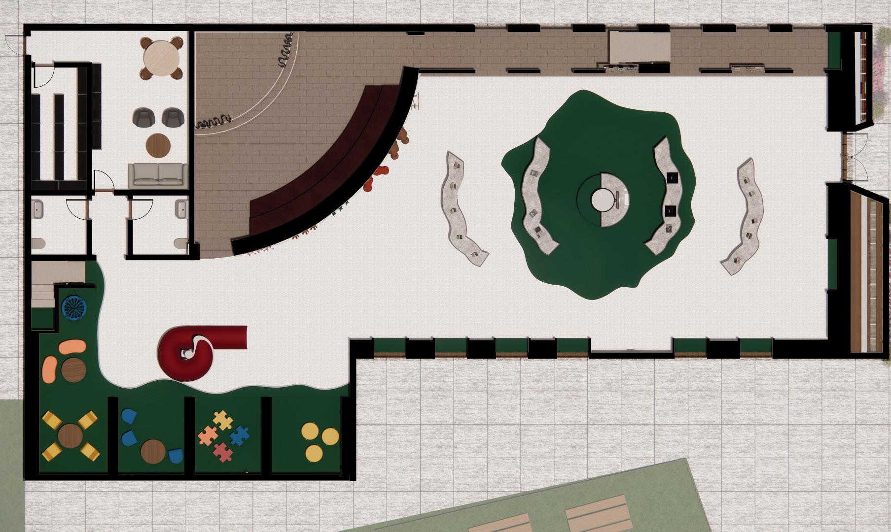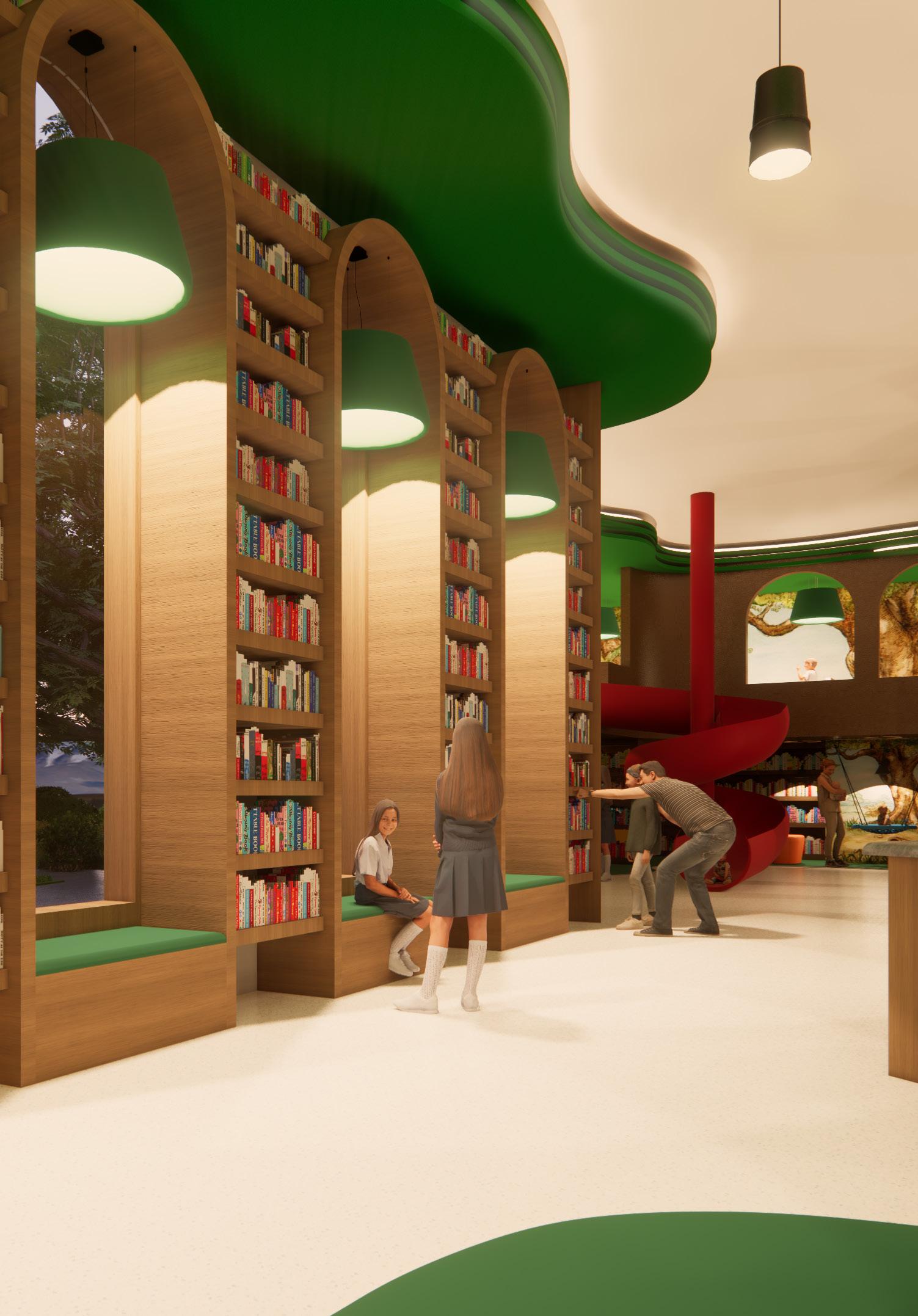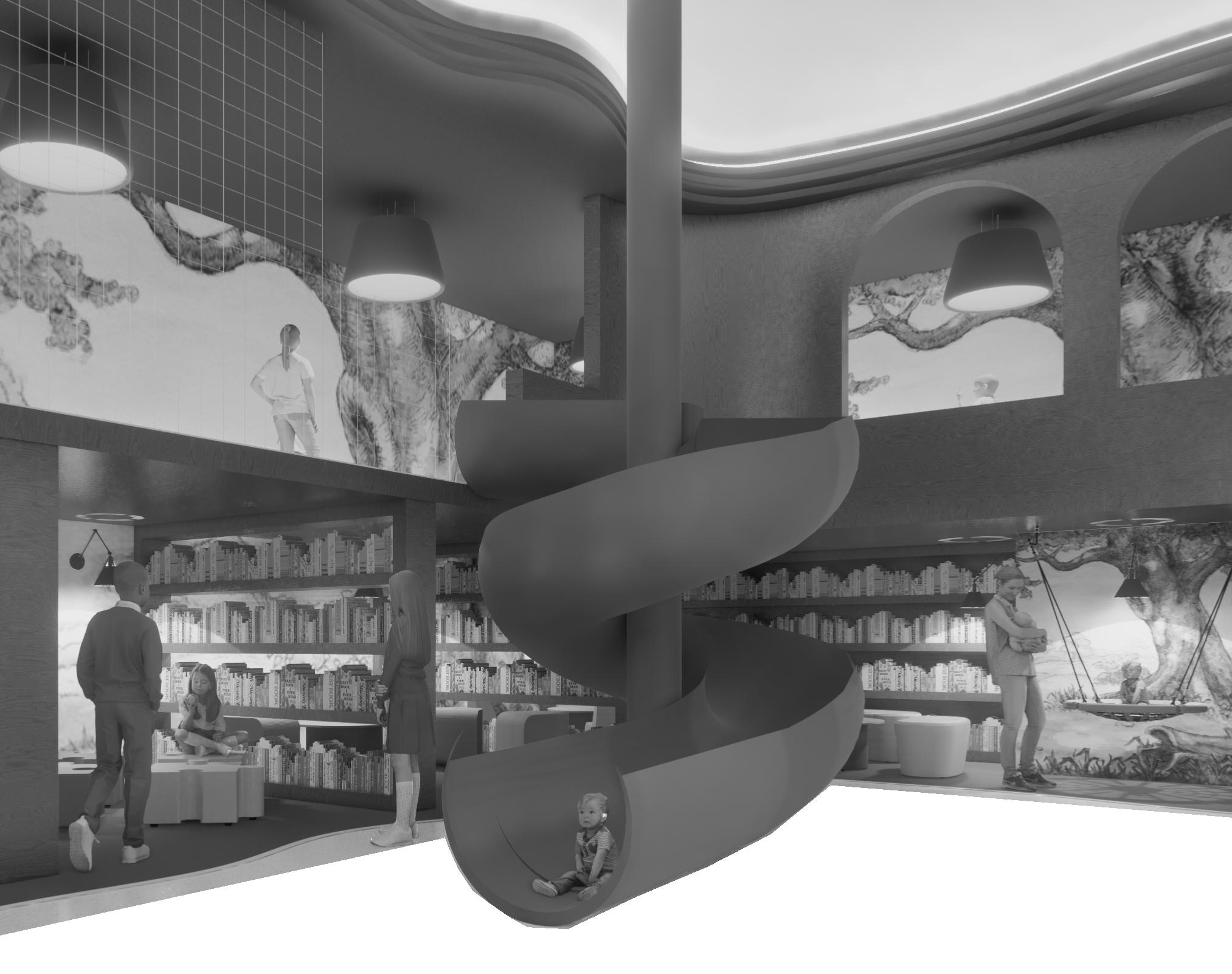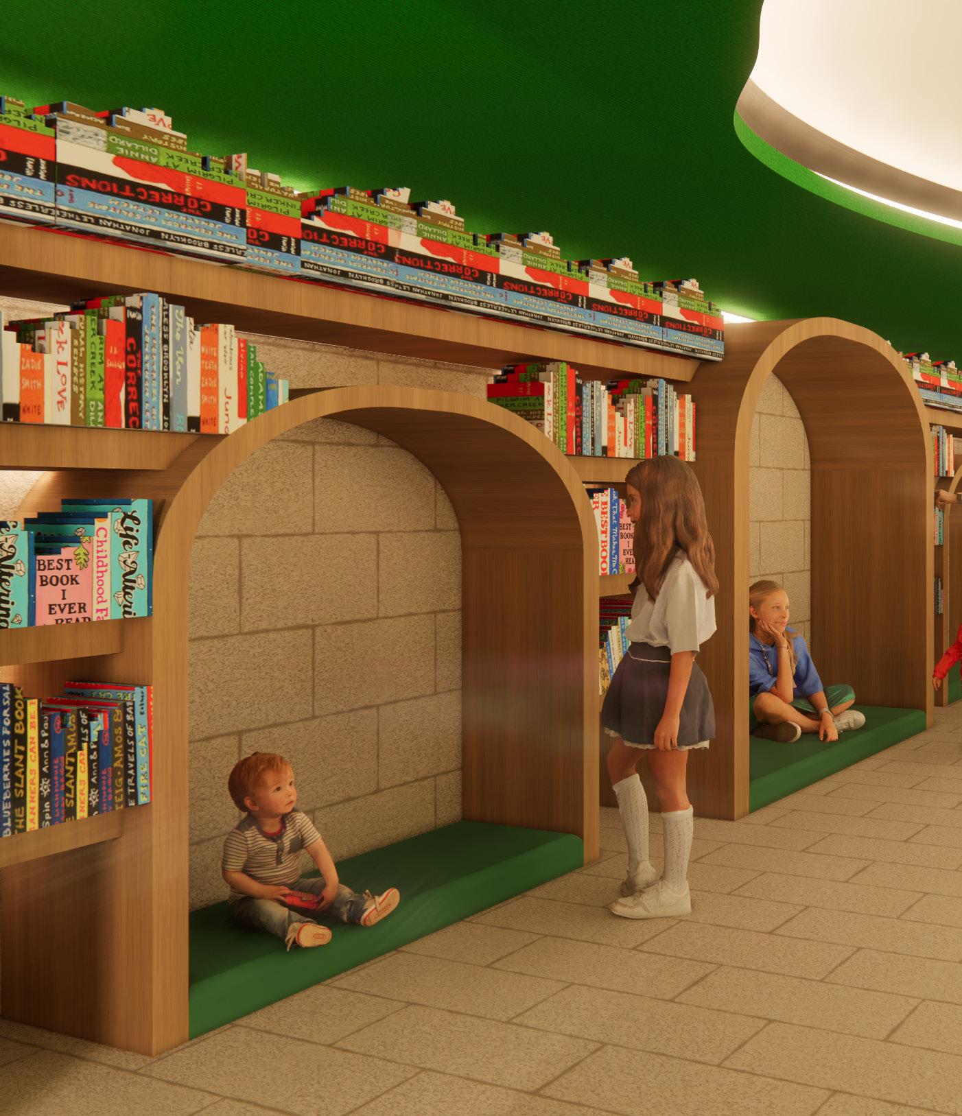 I designed diverse spaces to support various learning and reading styles. Public areas cater to children who enjoy stimulation, private zones offer quiet for focused readers, and play areas spark imagination and foster friendships.