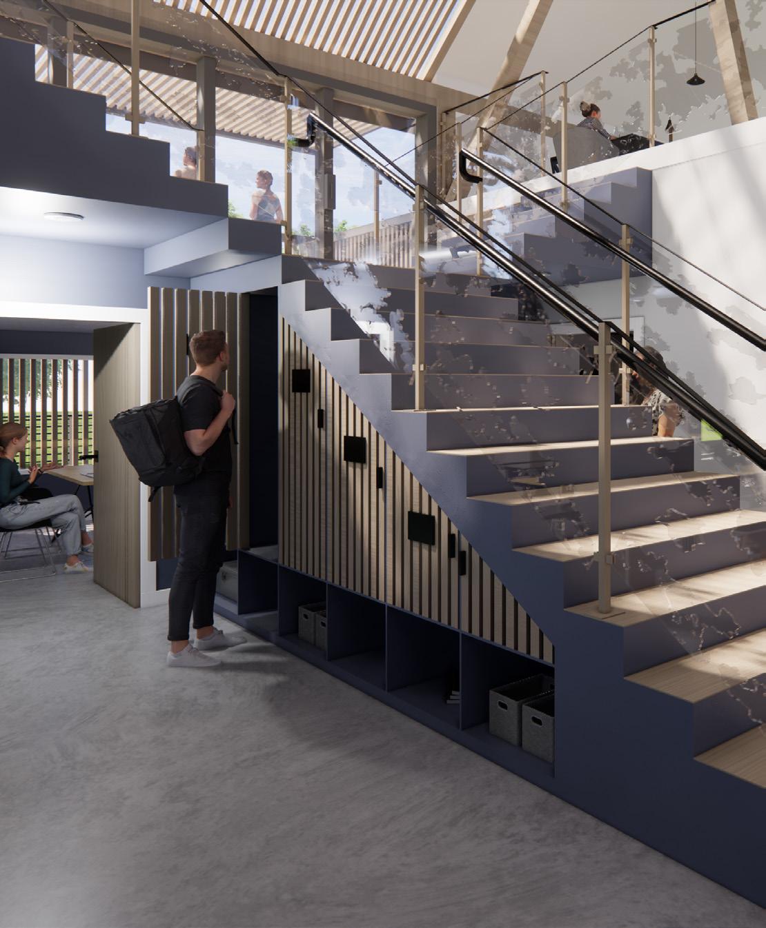 The exterior features vertical slats that provide shade while allowing natural light to filter through. Inside, they define spaces and lower the ceiling, enhancing the welcoming atmosphere. The layered ceiling and walls capture and diffuse light, creating dynamic moments as sunlight shifts throughout the day.