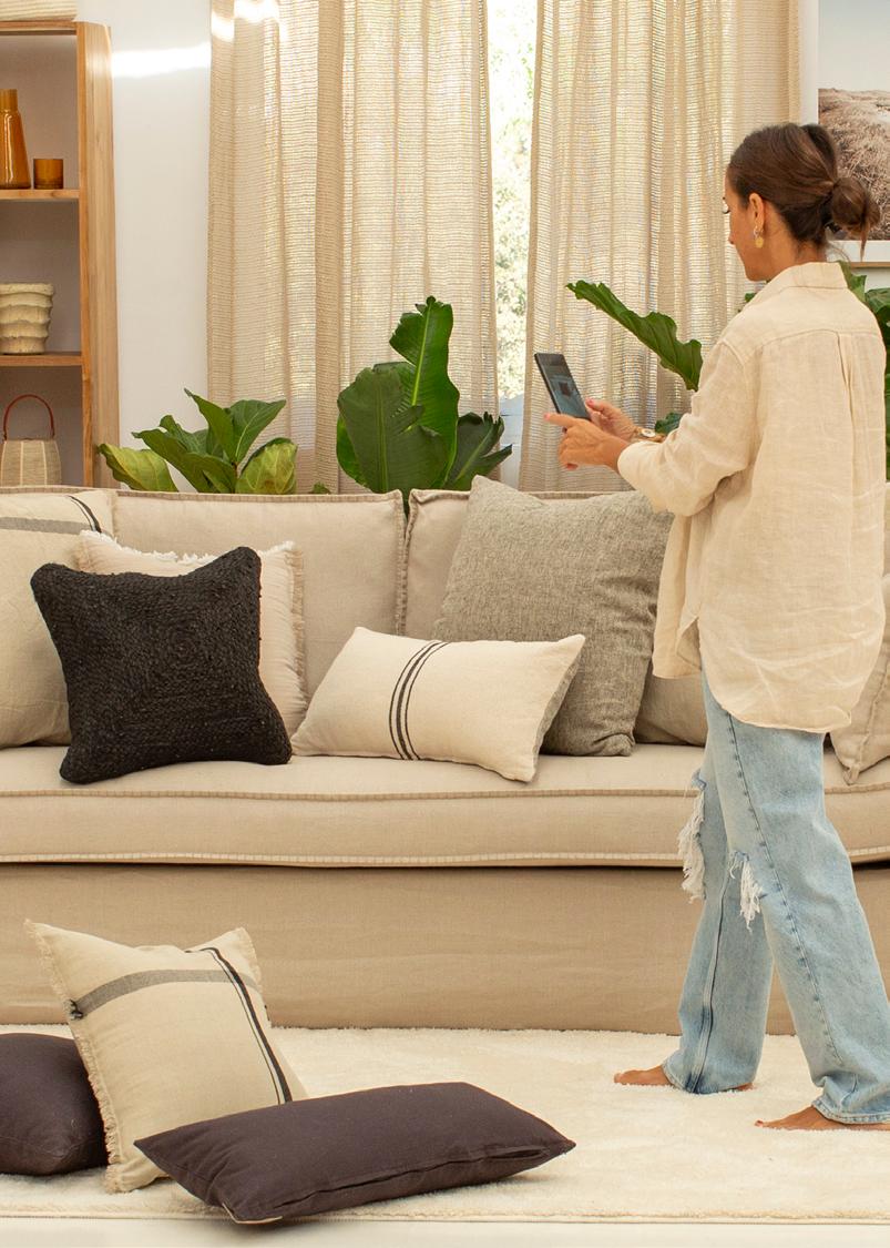 Calma House has an extensive range of product categories. Besides our star, the cushion cover that we also offer in an infinity number of colors, textures, fabrics and measures, rugs, poufs, curtains, towels, duvet covers, headboards, linen table and other complements and accessories.