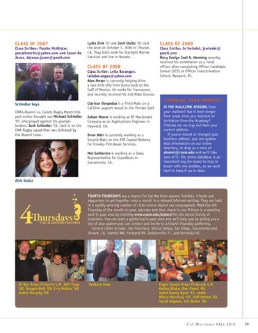FOURTH THURSDAYS are a chance for Cal Maritime alumni, families, friends and supporters to get together once a month in a relaxed informal setting. They are held in a rapidly growing number of cities where alumni are congregated. Mark the 4th Thursday of the month on your calendar and then check to see if there is a meeting spot in your area by visitiing www.csum.edu/alumni for the latest listing of locations. You can start a gathering in your area and we’ll help you by giving you a list of area alumni you can contact and invite to a Fourth Thursday gathering. Current cities include: San Francisco, Silicon Valley, San Diego, Sacramento and Oxnard, CA, Seattle WA, Portland OR, Jacksonville FL, and Honolulu HI.