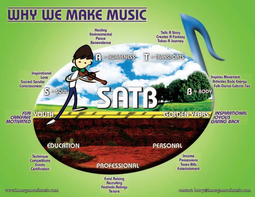 Accepting this s acred trust and responsibility reminds us that we have the opportunity to give something very special to those who listen to our music. By choosing to focus not on technique or approval but on sharing our deep musical feelings with others, we can make it so. You have an opportunity to give something very special to those who listen to your music To communicate feelings and inspiration through S.A.T.B.–Music for the S oul, Awareness, Transpor ting and the B ody