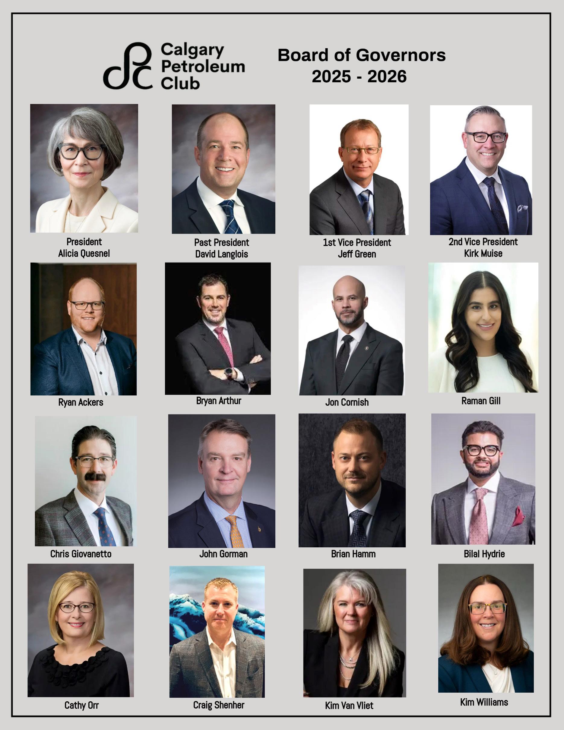 The Calgary Petroleum Club is operated by a Board of Governors and an experienced management team. The Board is made up of 16 elected Club Members, who serve a two- year term, while the President serves a one- year term. Representing the vision of the Club and the needs of the Members, the Board strives to make the services, amenities and offerings of the Club the very best they can be.