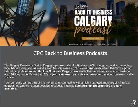The CPC Back to Business Podcast has featured some of Calgary’s top business leaders, entrepreneurs, and philanthropists. Each episode is inspiring, educational and engaging for listeners of all ages and backgrounds. We release a new episode every Monday morning at 7:00 AM, which is available on all major podcast channels. Launched in the fall of 2022, we have been privileged to feature an incredible lineup of guests and our audience continues to grow each week.