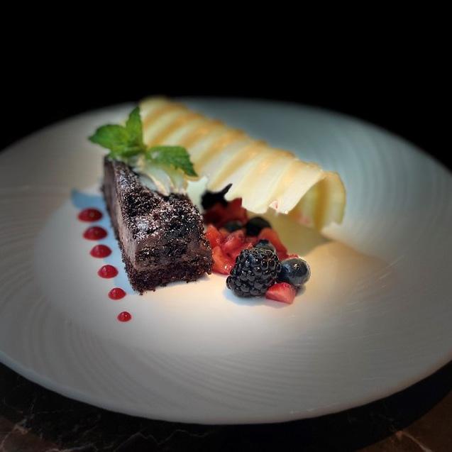 Decadent Chocolate Avalanche Cake, meltingly rich, paired with a warm, spiced mulled berry compote, creating an exquisite dessert experience.