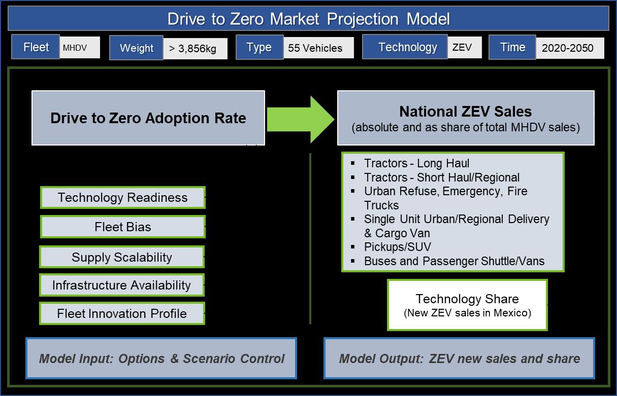 The projections outlined in this paper have been developed to identify Mexico’s ability to meet the targets set forth in the Global MOU, considering existing market conditions, barriers, opportunities, and sales data for the Mexican MHDV market. The analysis uses CALSTART’s Drive to Zero Market Projection Model to estimate the adoption rate of on-road ZE-MHDVs in Mexico.