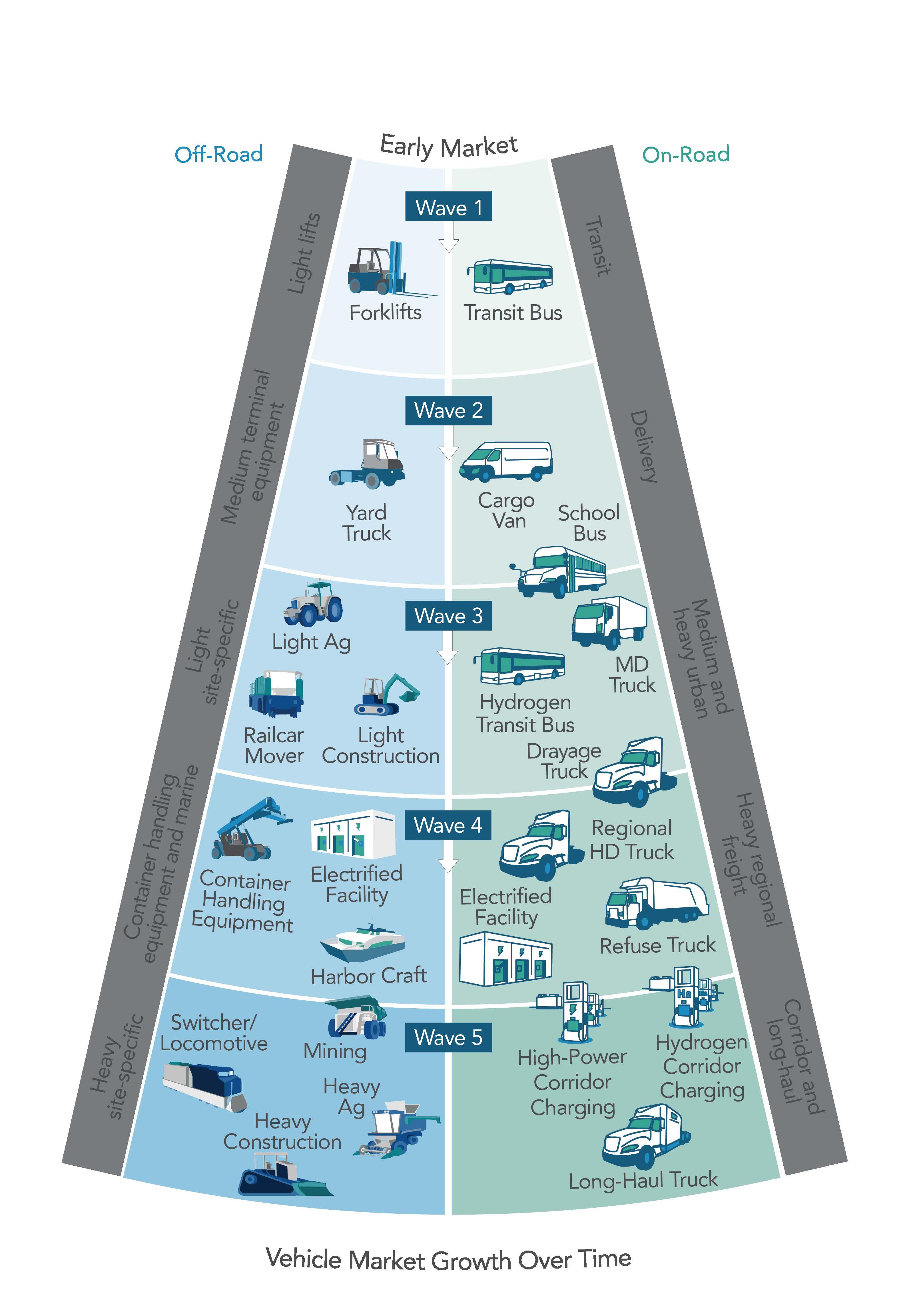 ZEB adoption has continued to grow as organizations take advantage of the expanding number of vehicle models available and the advancements in battery-electric and fuel cell electric technologies. As a broader view, Figure 1 is the most recent update of the zero-emission beachhead strategy, which was developed by CALSTART in partnership with the California Air Resources Board (CARB) to trace zero-emission technology adoption progress across different types of commercial vehicles, including buses ZEBs are a foundational commercial vehicle market segment where zero-emission and near-zero-emission technologies are most likely to succeed first and can also contribute to the development of vehicles in other segments.