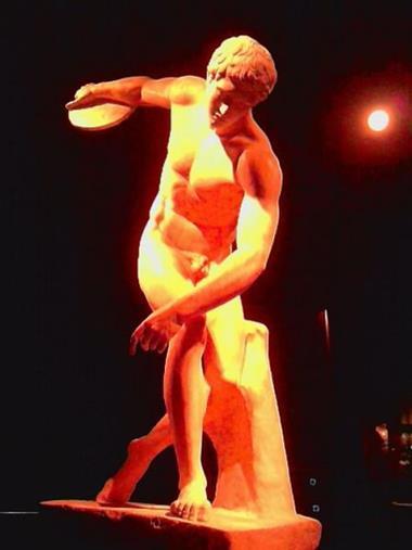 Figurilla femenina embarazada de la cultura cicládica, hecha en mármol, conserva restos de ocre.