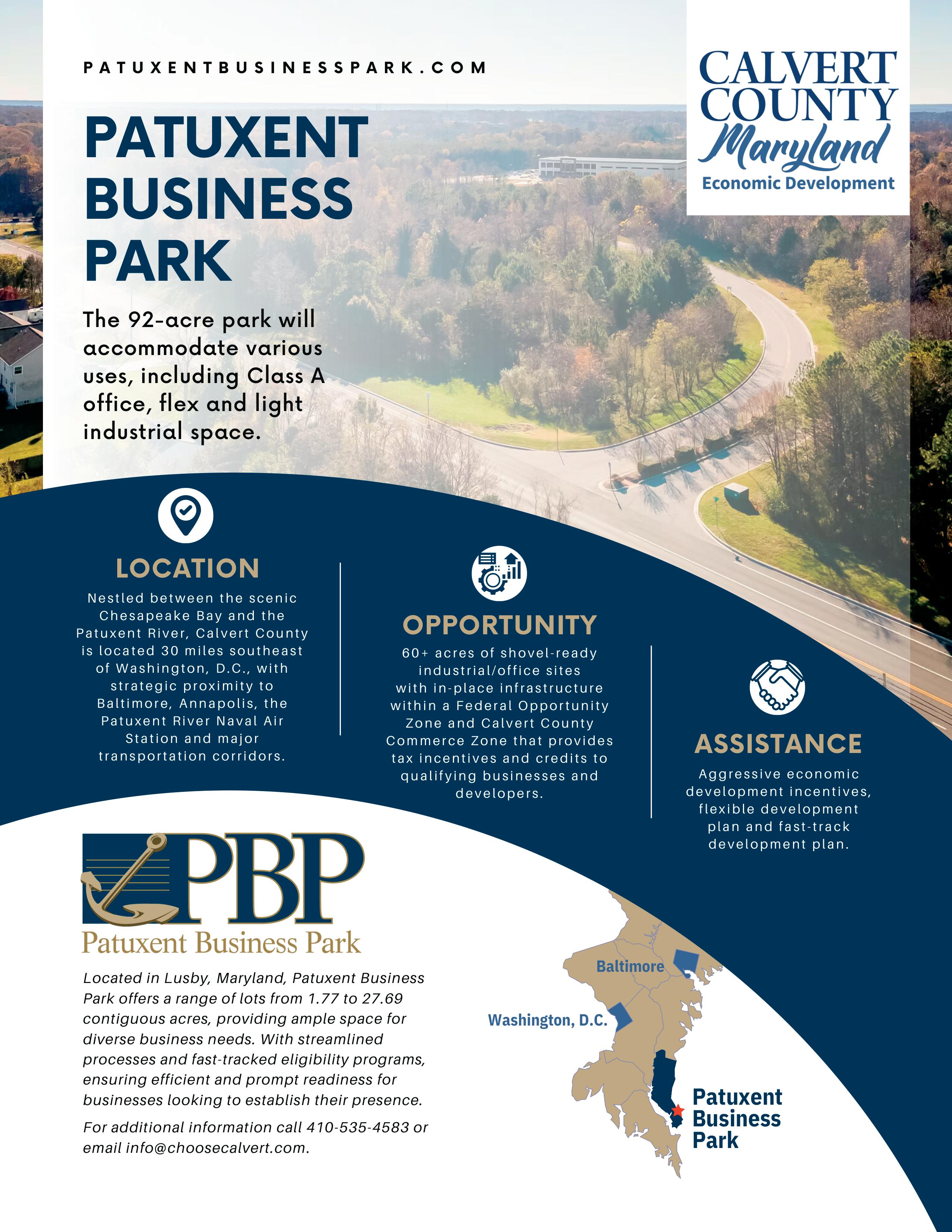 Nestled between the scenic Chesapeake Bay and the Patuxent River, Calvert County is located 30 miles southeast of Washington, D.C., with strategic proximity to Baltimore, Annapolic, the Patuxent River Naval Air Station and major transportation corridors.