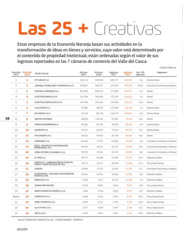 Las 25 + Creativas Estas empresas de la Economía Naranja basan sus actividades en la transformación de ideas en bienes y servicios, cuyo valor está determinado por el contenido de propiedad intelectual; están ordenadas según el valor de sus ingresos reportados en las 7 cámaras de comercio del Valle del Cauca. Unidad: $ Millones Posición Posición 2017 2018