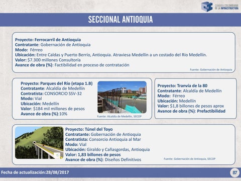 SECCIONAL ANTIOQUIA Proyecto: Ferrocarril de Antioquia Contratante: Gobernación de Antioquia Modo: Férreo Ubicación: Entre Caldas y Puerto Berrío, Antioquia. Atraviesa Medellín a un costado del Río Medellín. Valor: $7.300 millones Consultoría Avance de obra (%): Factibilidad en proceso de contratación Fuente: Gobernación de Antioquia