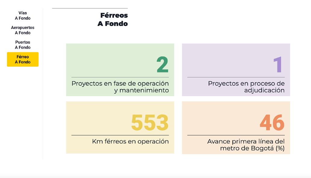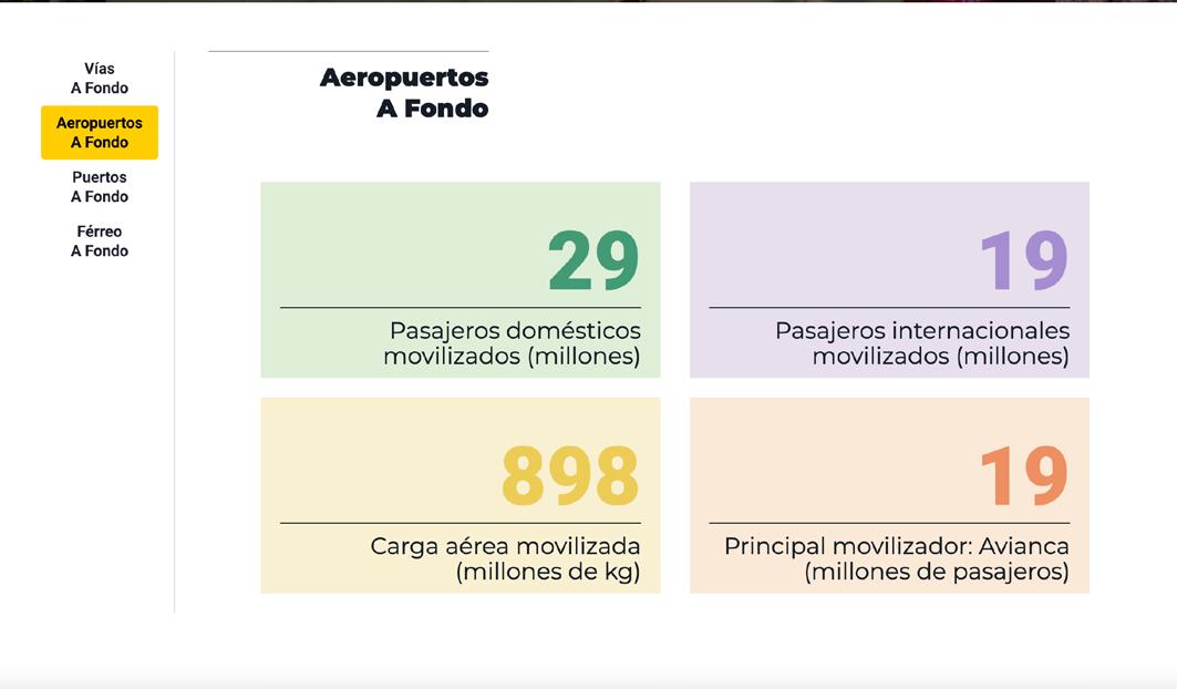 En el caso de proyectos de obra pública, se relacionan cifras de porcentaje de avance físico y avance financiero de cada uno de los proyectos que conforman los programas ‘Reactivación 2.0’, ‘Legalidad’ y ‘Caminos Comunitarios de la Paz Total’. Asimismo, para cada uno de los aeropuertos del país, se presenta de manera interactiva el movimiento de pasajeros y carga doméstico e internacional.