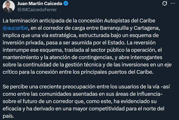 El pasado 14 de enero, a través de su cuenta de X, el presidente de la CCI, Juan Martín Caicedo, se pronunció sobre los enfoques de inclusión en la contratación pública y destacó que el gremio de la infraestructura ha sido, en los hechos, incluyente. Señaló que las empresas del sector abren sus puertas al talento