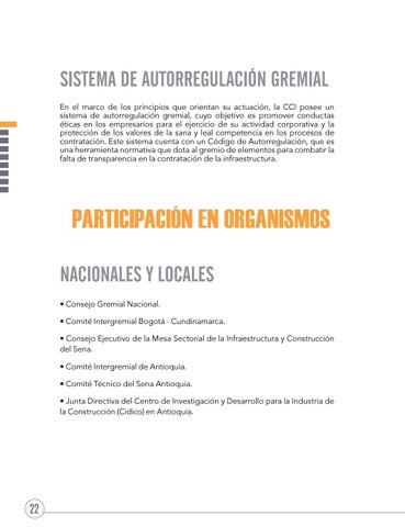 PARTICIPACIÓN EN ORGANISMOS Nacionales y locales • Consejo Gremial Nacional. • Comité Intergremial Bogotá - Cundinamarca. • Consejo Ejecutivo de la Mesa Sectorial de la Infraestructura y Construcción del Sena. • Comité Intergremial de Antioquia. • Comité Técnico del Sena Antioquia. • Junta Directiva del Centro de Investigación y Desarrollo para la Industria de la Construcción (Cidico) en Antioquia.
