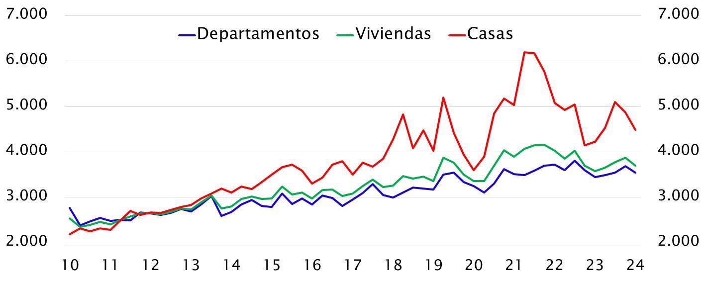 El encarecimiento de las viviendas nuevas ha sido significativo desde 2020, especialmente en el mercado de casas. Entre 2022 y 2023 se observa un ajuste a la baja de los precios en un escenario de débil demanda. Al primer trimestre de 2024 el valor promedio de las departamentos es 3% superior a su símil de 2023, mientras que el precio de las casas aumenta 6%.