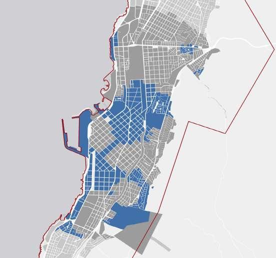 La superposición de los resultados de cada uno de los criterios permite identificar aquellos sectores de la ciudad en los que podría ser óptimo permitir y fomentar equipamientos de tipo hospital. En la cartografía de la figura 16 se leen en gris claro todas las manzanas que se emplazan al interior del límite urbano de la ciudad y en gris oscuro aquellas que corresponden al área más central de la ciudad. Se identifican en azul todas las manzanas que podrían contener este tipo de uso preferente dado que cumplen con los criterios establecidos en la tabla de la figura 15. Finalmente se establece que el emplazamiento de este tipo de equipamientos debiese estar definido por un instrumento de mayor jerarquía que un plan regulador comunal, dado su impacto intercomunal o regional.